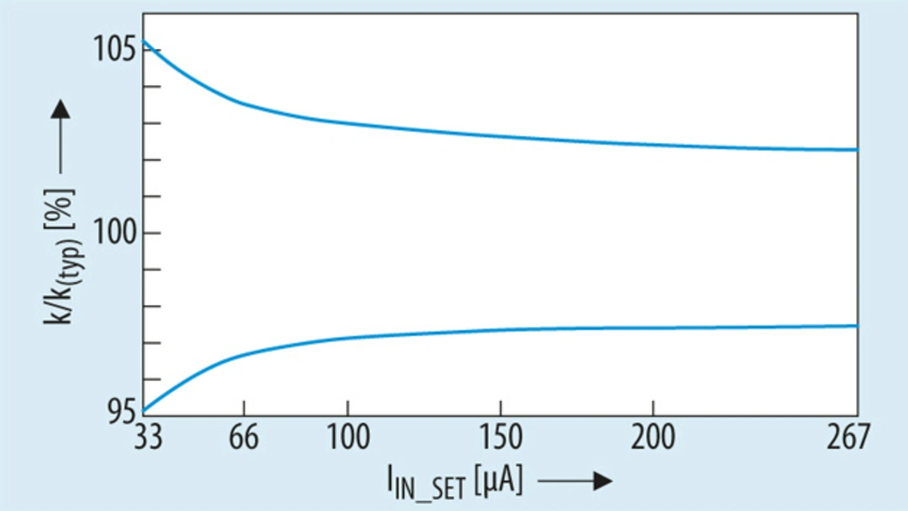 Alle Treiber haben integrierte Schutzfunktionen bei Überlast, Kurzschluss und Übertemperatur; sie sind außerdem verpolgeschützt (Reverse Battery Protection). Der Eingangsspannungsbereich der Familie reicht von 5,5 V bis zu 40 V, hierbei unterstützen die Bausteine einen LED-Strombereich von 5 mA bis zu 360 mA. Dabei erfüllt die hohe Stromgenauigkeit des LITIX Basic+ die globalen Anforderungen der Automobilzulieferer (Bild 2). Die Stromgenauigkeit wird durch den k-Faktor definiert. Er ist das Verhältnis von Ausgangsstrom zu Referenzstrom. In manchen Regionen wird für den LED Strom eine Genauigkeit von 5 % gefordert. Das günstige EMV-Verhalten des Bausteins reduziert den Bedarf an zusätzlichen Filterkomponenten für ein robustes System. Dies spart weitere Systemkosten.
