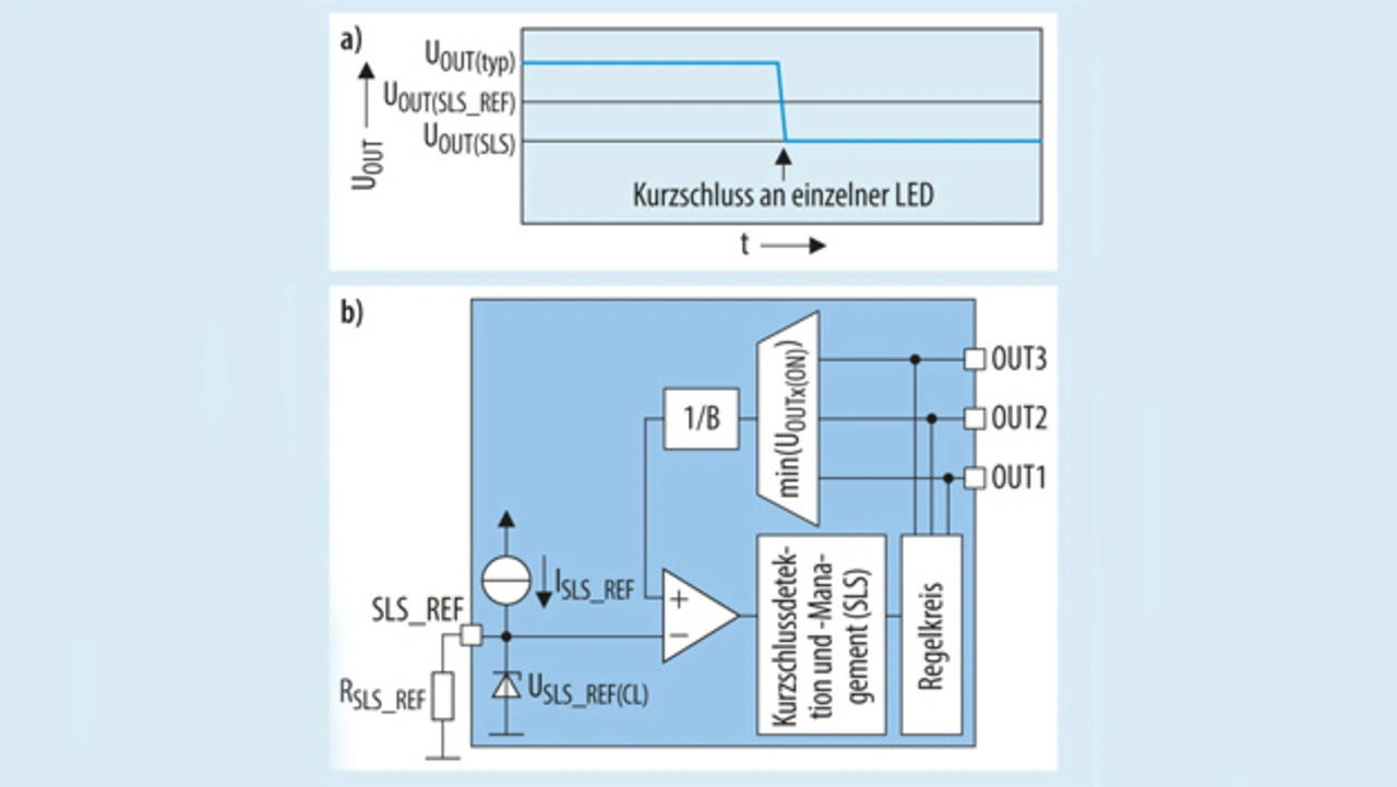 Für die Fehlerdiagnose vergleicht der Baustein die Spannungen der LED-Ketten mit einer frei konfigurierbaren Referenzspannung. Falls eine LED innerhalb einer LED-Kette einen Kurzschluss aufweist, verringert sich die Ausgangsspannung des Kanals, der die fehlerbehaftete LED-Kette treibt. Diese Verringerung entspricht ungefähr der Vorwärtsspannung einer LED (Bild 4a). Der Ausgangsstrom fließt weiterhin durch die LEDs, da immer noch ein geschlossener Stromkreis besteht. Da die Ausgangsspannung unter den Referenzspannungswert UOUT (SLS_REF) fällt, erkennt der Baustein den Fehler.