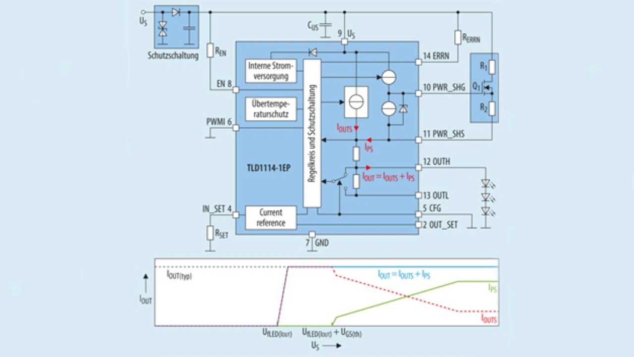 Fällt eine LED im Bremslicht aus, muss das Steuergerät den Fehler erkennen. Heutige ICs bieten Kurzschlusserkennung bis hinab zur einzelnen LED und konfigurierbares Verhalten im Fehlerfall.