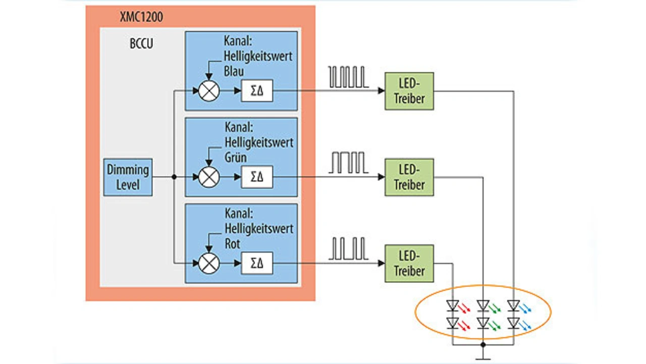 Die Serien XMC1200, XMC1300 und XMC1400 arbeiten mit einer integrierten Helligkeits- und Farbsteuerungseinheit (Brightness and Color Control Unit, BCCU). Ein Blockschaltbild der BCCU ist in Bild 1 zu sehen. Ihre grundsätzliche Funktion besteht darin, automatisch Dimmsignale an den Port-Anschlüssen für externe LED-Treiber zur Verfügung zu stellen. Die BCCU ist – bei minimalem Code-Aufwand – für die automatische Steuerung der Dimmung und der Farben von mehrkanaligen LED-Lampen ausgelegt.