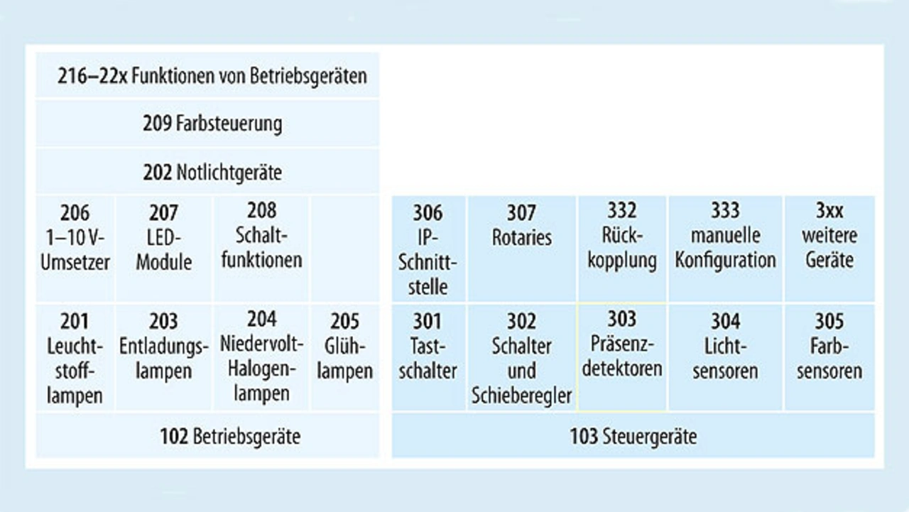 DALI 2 ist dafür ausgelegt, Lücken im ursprünglichen Standard zu schließen und eine bessere Interoperabilität zu ermöglichen. Wurden ursprünglich nur Betriebsgeräte und die allgemeine Kommunikation beschrieben, eröffnet DALI 2.0 Herstellern und Anwendern die Welt der Sensorik. Daher wurde die IEC 62386 um den Teil 103 (Steuergeräte) erweitert (Bild 2). Neue Gerätetypen aus dem Bereich der Sensoren, wie etwa Taster, Lichtsensoren, Bewegungssensoren oder Fernbedienschnittstellen, sind nun in der Norm definiert.