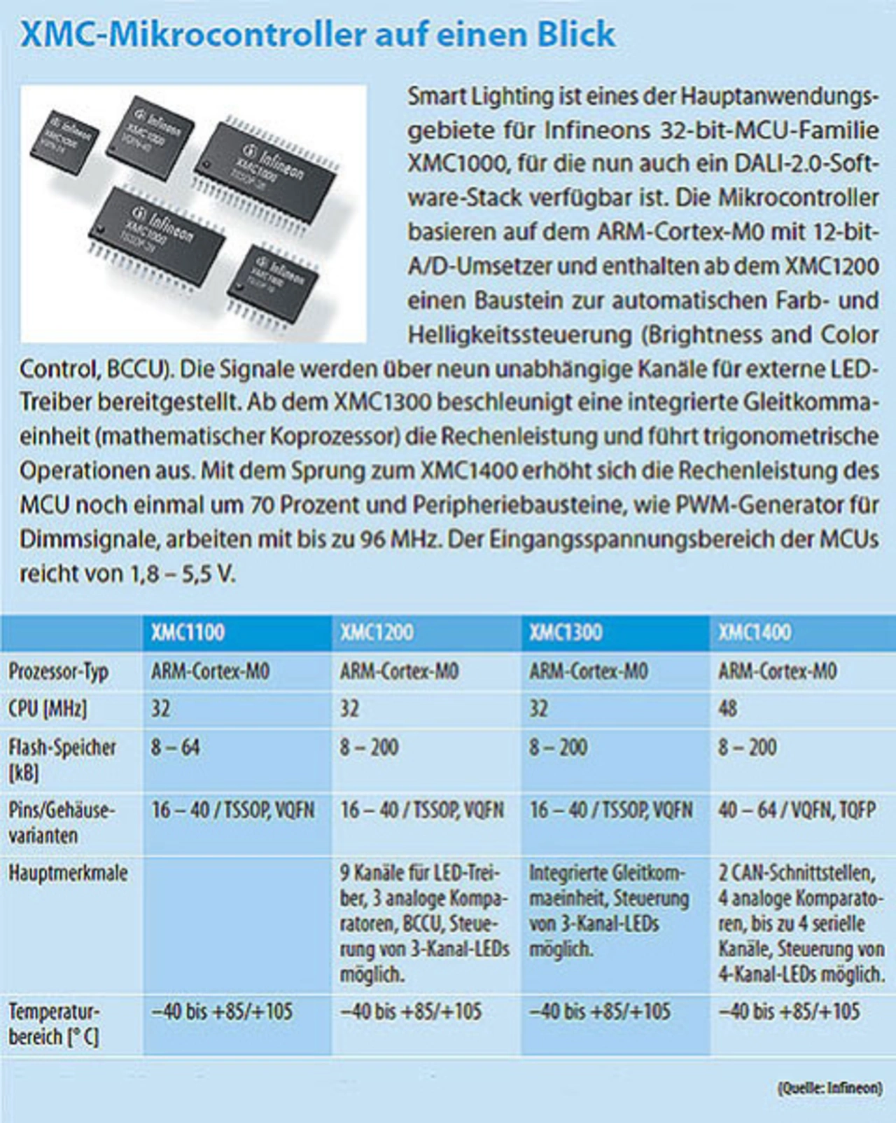 Mit spezieller Peripherie und Funktionalitäten sind XMC-1000-Mikrocontroller u.a. prädestiniert für zahlreiche moderne LED-Beleuchtungssysteme. Die MCU-Familie (siehe Kastenbild: XMC-Mikrocontroller auf einen Blick) steht in den Serien XMC1100, XMC1200, XMC1300 und XMC1400 mit Flashvarianten bis zu 200 kB und Gehäusen mit bis zu 64 Pins zur Verfügung. Sie unterstützen eine automatische Dimmung und die Farbansteuerung für mehrkanalige LEDs.