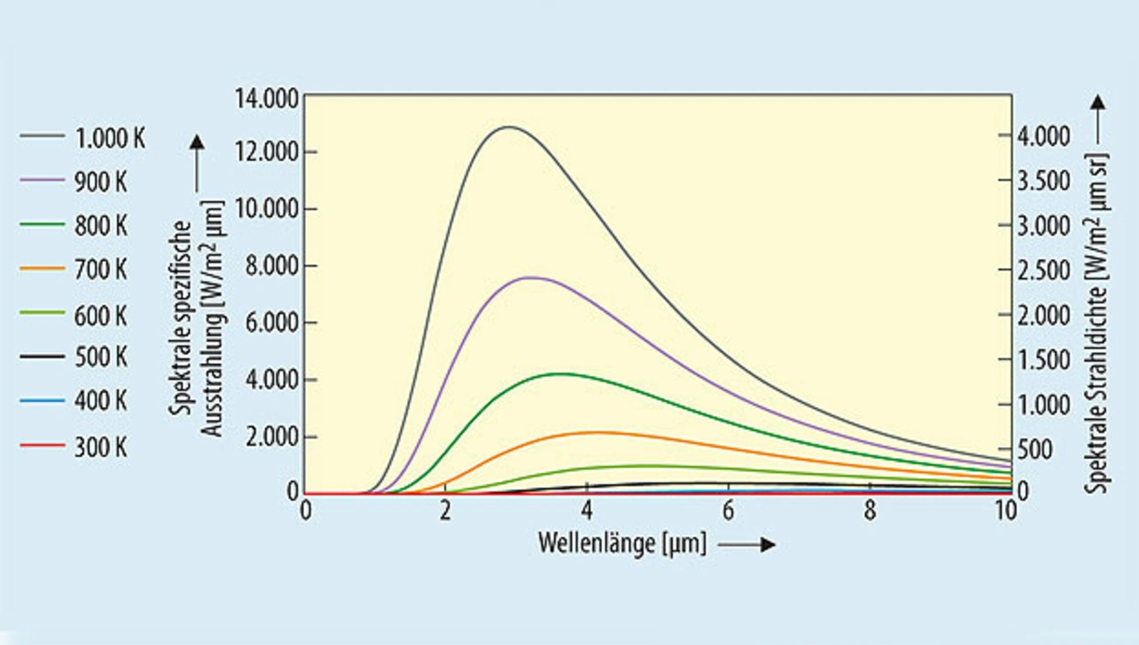 Im Gegensatz zur Konvektion und Wärmeleitung findet der Wärme-Transfer durch Strahlung nicht über Trägermedien statt, sondern über die Absorption und Emission elektromagnetischer Wellen. Jeder Körper mit einer Temperatur von T > 0 K (Kelvin) emittiert elektromagnetische Strahlung. Das Plancksche Strahlungsgesetzt beschreibt dabei die spektralspezifische Intensität eines idealen schwarzen Strahlers (Bild 3).