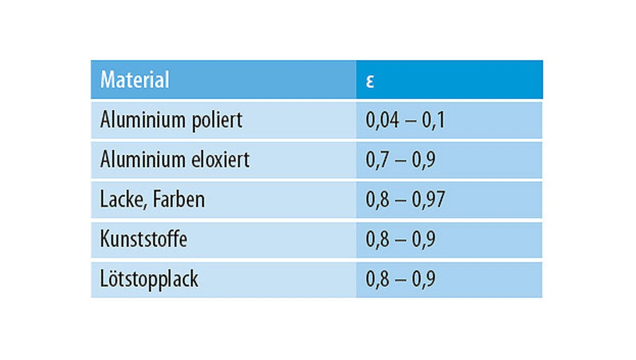Das Material eines Körpers und seines Oberflächen-Charakters beeinflussen den Emissionsgrad signifikant. In der Regel haben nichtmetallische und nichttransparente Objekte eine gute Wärmeabstrahlung mit einem über 80-prozentigen Emissionsgrad. Bei Metallen kann dieser Grad zwischen fünf und 90 Prozent variieren. Je glänzender das Metall, desto geringer sein Emissionsgrad. Beispiele für den Emissionsgrad verschiedener in einem elektronischen System verwendeter Materialien sind in Tabelle 2 zusammengestellt.
