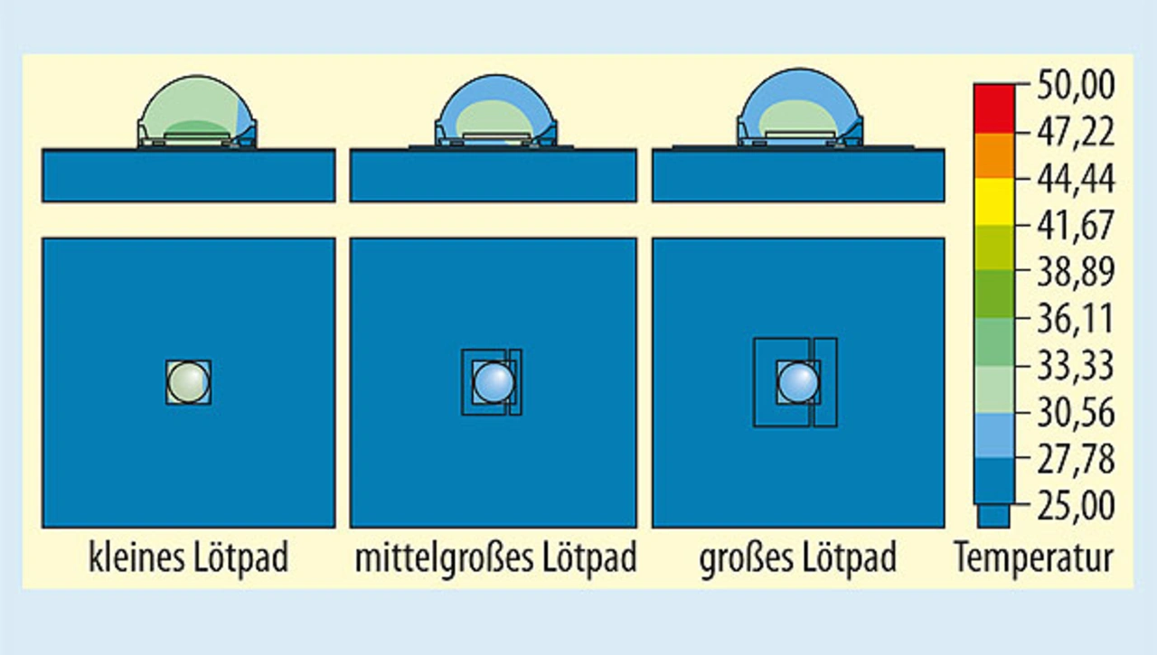 Das Variieren der Größe der Kupferpads führt zu unterschiedlichen Werten für den gesamten thermischen Widerstand von der LED-Sperrschichttemperatur zur Unterseite der Leiterplatte (Rthjbel). Die Simulationsergebnisse zeigt Bild 6; in Tabelle 3 sind die in der Simulation errechneten Werte für Rthjbel sowie die Sperrschichttemperaturen hinterlegt. Die unterschiedlichen thermischen Widerstände haben dann auch einen größeren Temperaturunterschied zwischen Platinen-Unterseite und LED Sperrschichttemperatur zur Folge.