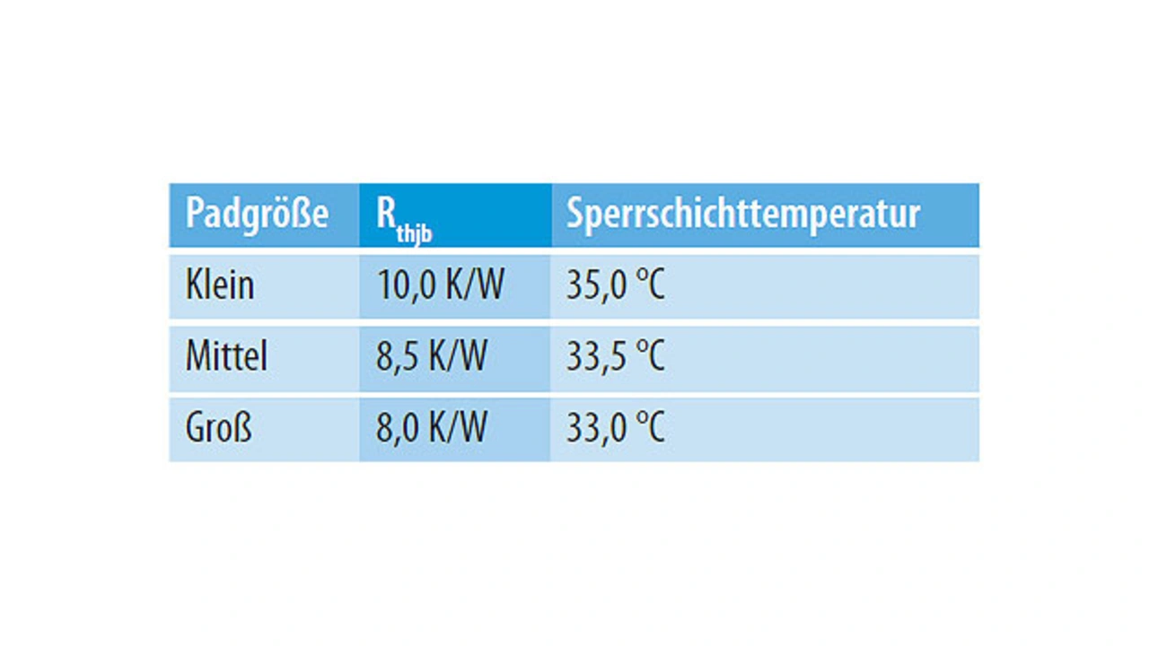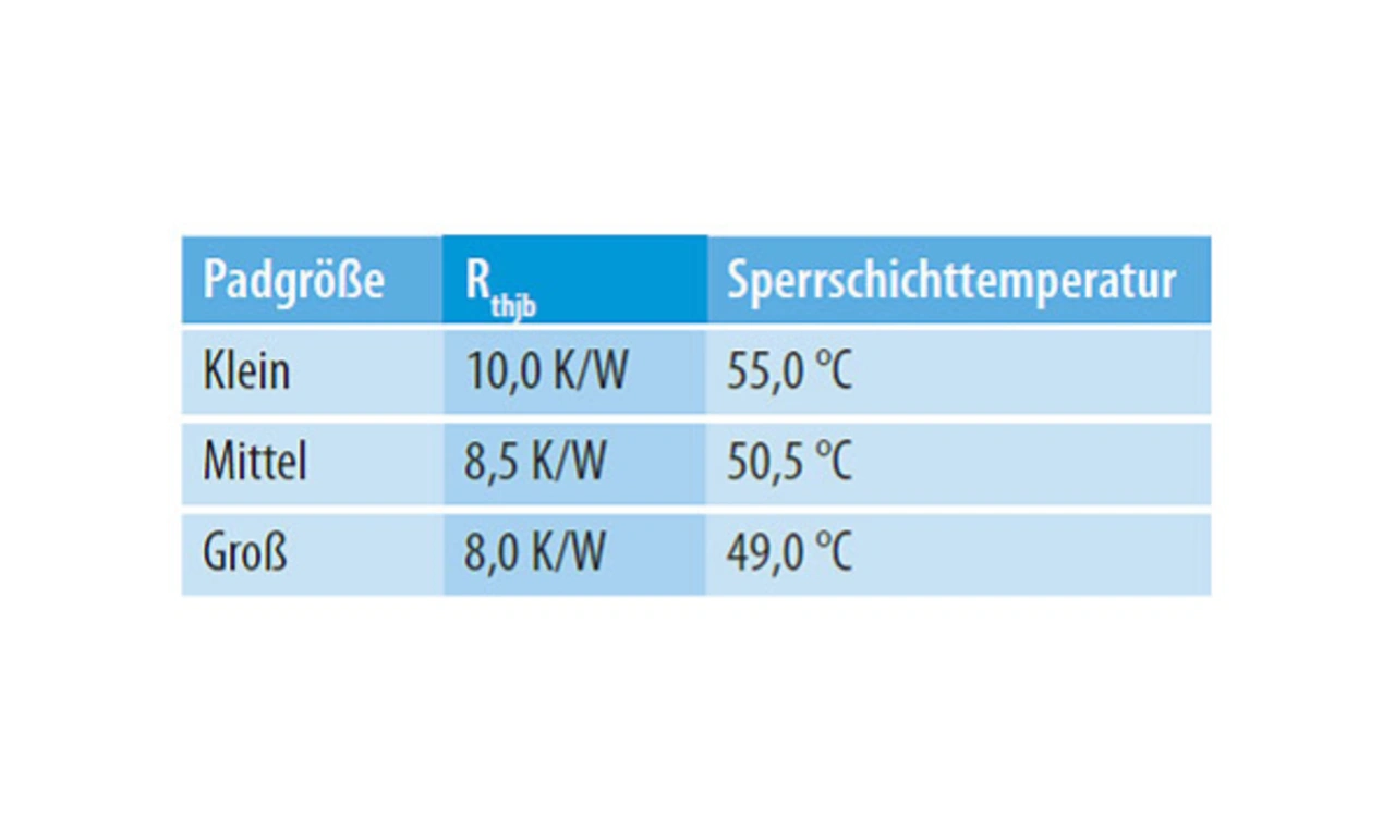 Aus diesen Ergebnissen kann man entnehmen, dass eine Vergrößerung des Lötpads zu einer Verringerung der Sperrschichttemperatur führt. Ab einer gewissen Padgröße ändert sich die Temperatur nicht mehr signifikant. Bei Verwendung von thermisch schlechteren Metallkernplatinen (höhere Dielektrikumsdicke, schlechterer Dielektrikumswärmeleitwert) kann sich die Sperrschichttemperatur noch signifikanter verändern.