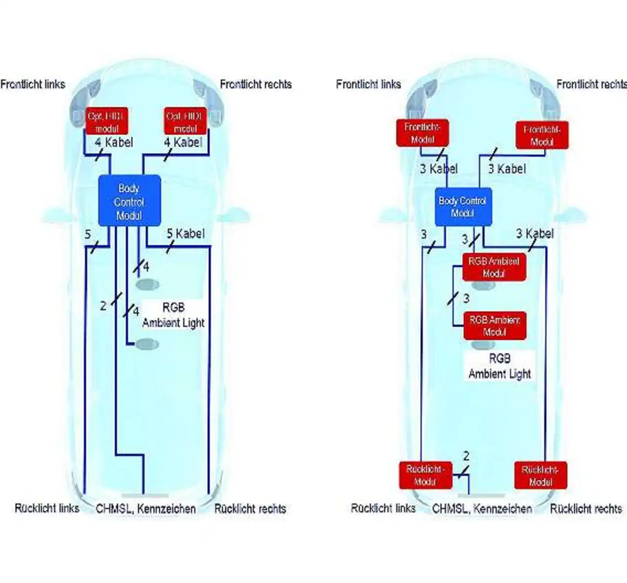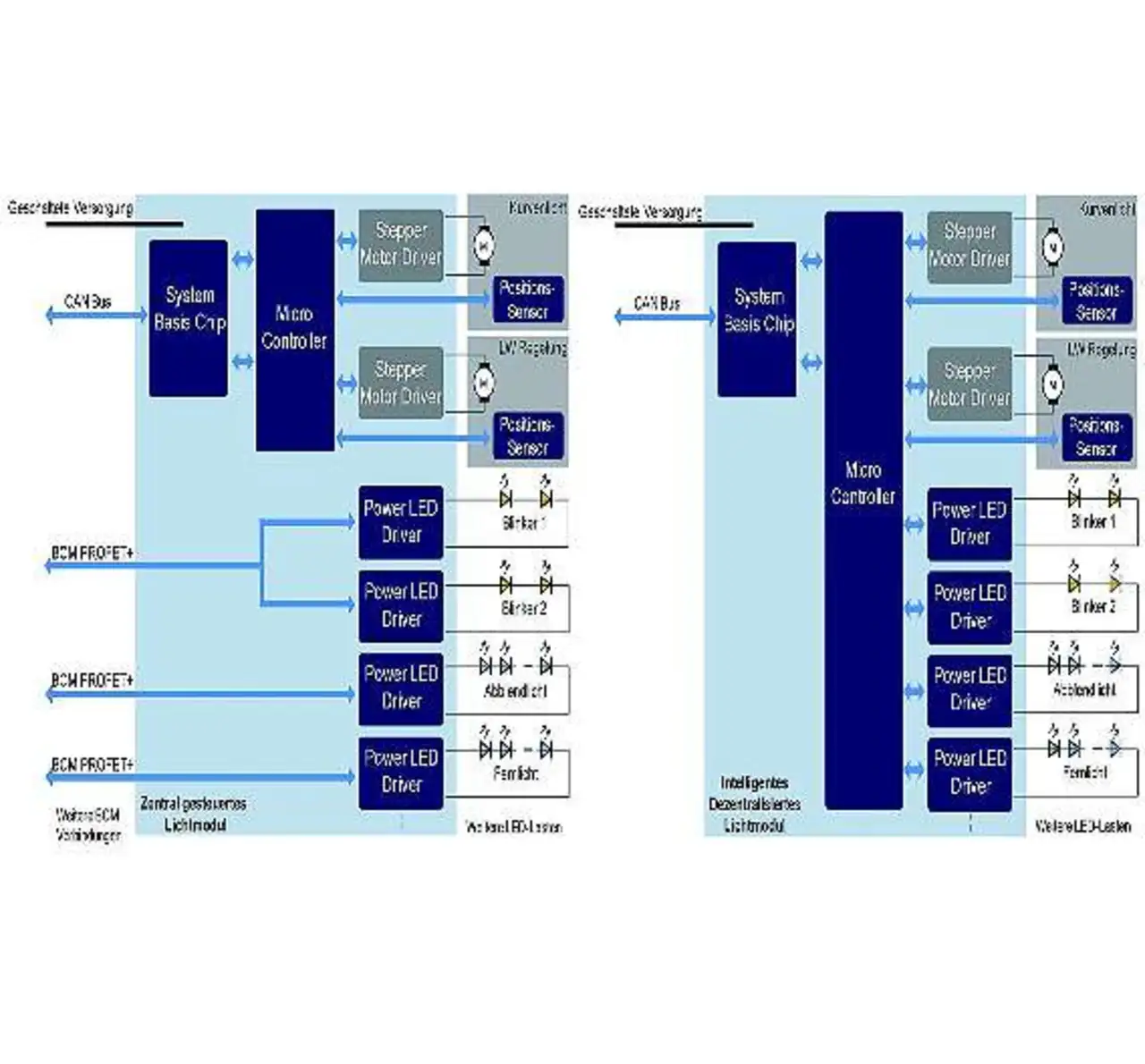 Folglich ist der Schritt zu einer innovativen Body-Elektronik-Architektur nur mehr klein. Mit dezentralen Lichtmodulen kann dieses alle Funktionen wie Dimmen, Diagnose oder Fail-Safe-Funktionen direkt selber durchführen. Die »Intelligenz« und Leistung der Lichtmodule steigen auf der einen Seite, auf der anderen Seite entspannen sich die oben genannten kritischen Punkte des BCMs.