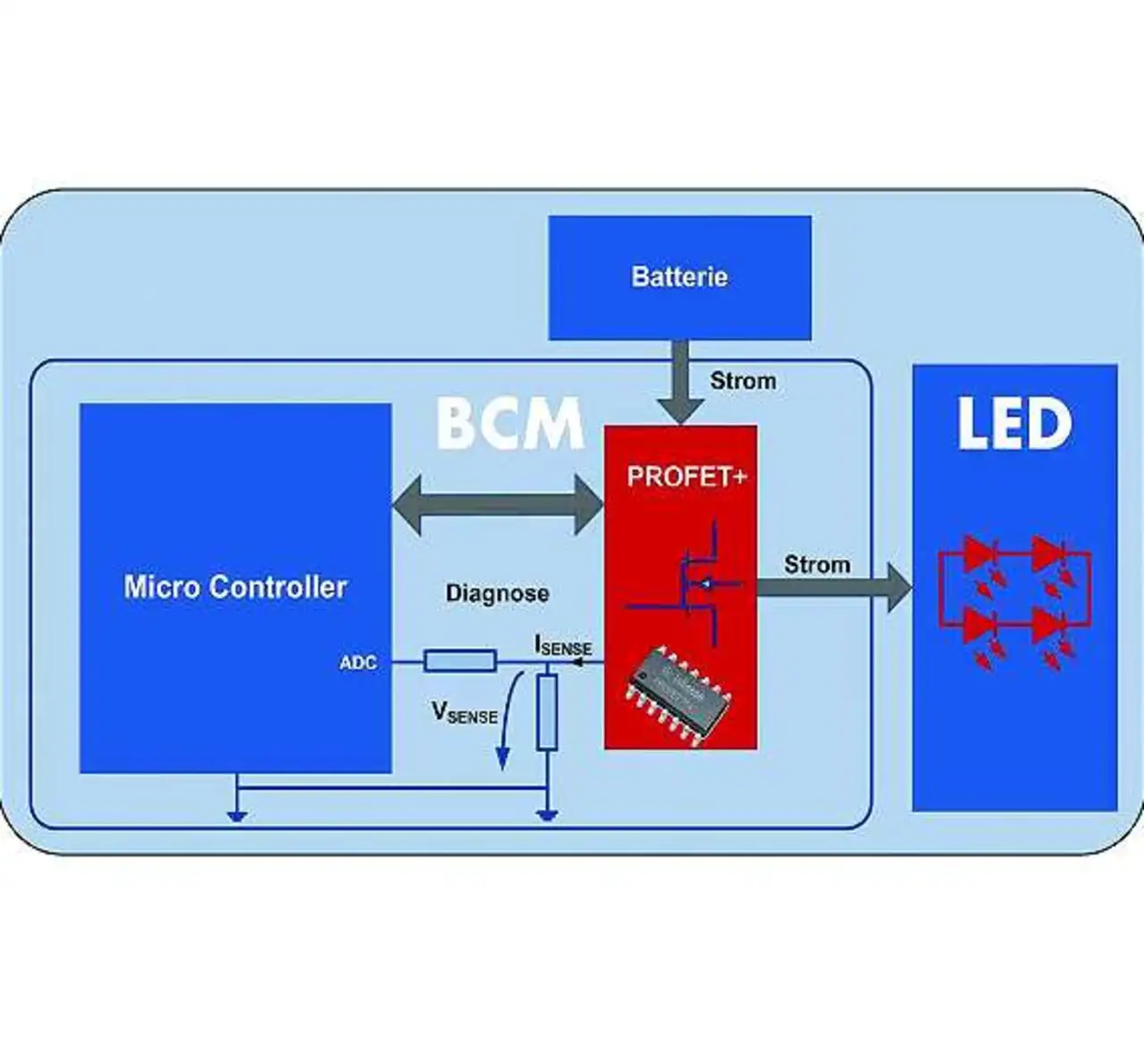 Die Steuerung und Diagnose der Lasten (also der Lichtquellen) wird mit-tels integrierter Halbleiterschalter am BCM, wie zum Beispiel Infineons neuester »PROFET+«-Familie, durchgeführt. Typischerweise ist das BCM im Fahrgast- oder Motorraum in einem Kunststoff- oder einem partiell aus Aluminium gefertigten Gehäuse angebracht. Body-Elektronik-Architekturen für die Ansteuerung von LED-Leuchten sind sehr ähnlich zu denen der Glüh- und Halogenlampen aufgebaut.