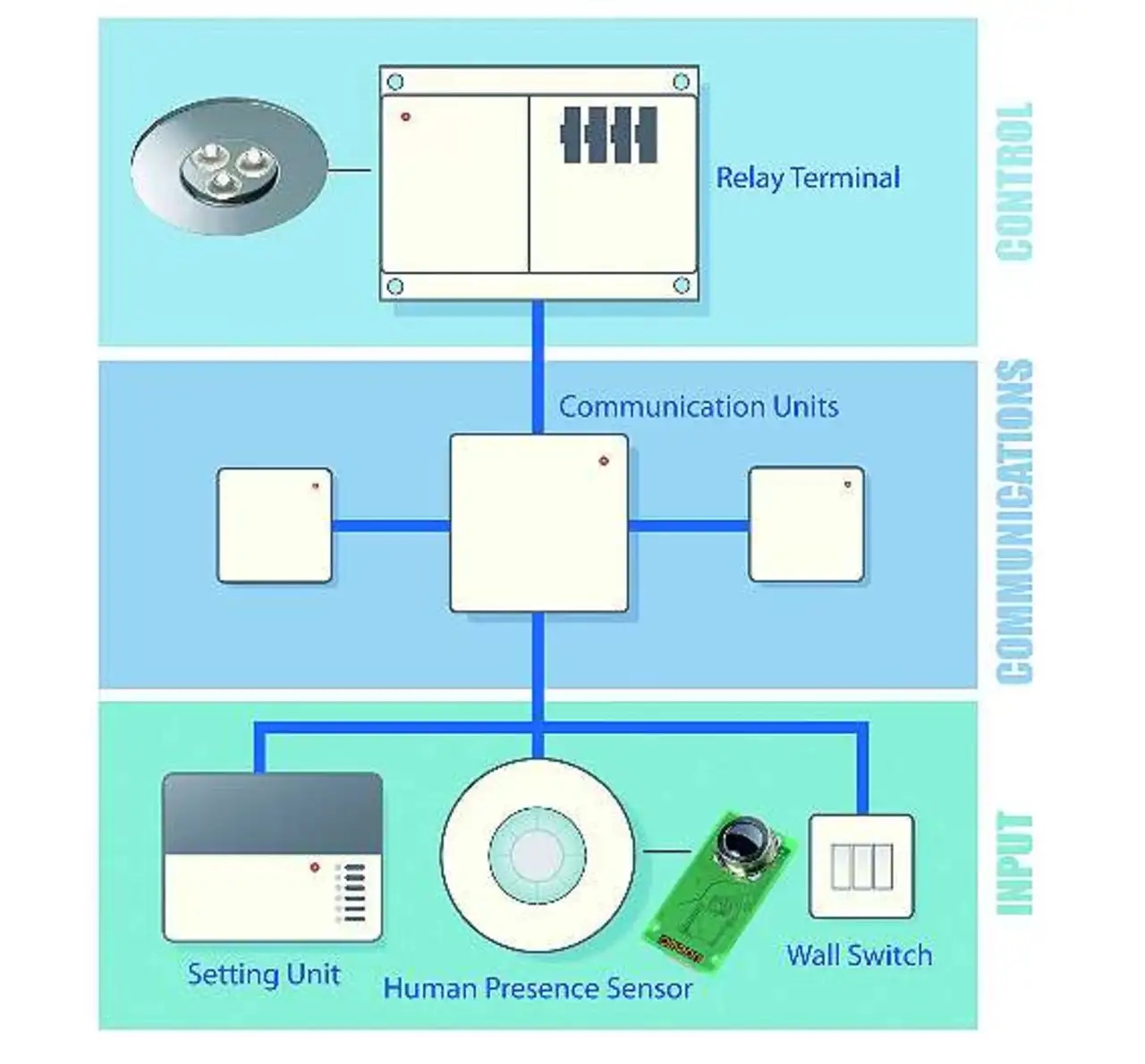 Ein automatisches Beleuchtungssystem besteht aus drei grundlegenden Bereichen: Dateneingang, Kommunikation und Steuerung (Bild 2). Der Dateneingang erfolgt über Sensoren wie Präsenzmelder und eventuell ein Zeitmessgerät oder ein Bedienfeld, das beispielsweise die zeitliche Verzögerung bis zur Lichtabschaltung regelt, nachdem die letzte Person den Raum verlassen hat. Diese Sensoren müssen mit dem Beleuchtungselement kommunizieren können, müssen sich aber von einem Wandlichtschalter auch überbrücken lassen.