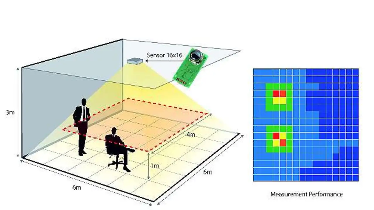 Zum Beispiel kann eine deckenmontierte Zentralsensoreinheit mit 16x16 Sensoren eine Fläche von 6x6 Metern erfassen und eine Person darin exakt lokalisieren (Bild 3). Diese Sensoren verfügen über breite Betrachtungswinkel und schnelle Reaktionszeiten, sodass wenige Sensoren weite Bereiche abdecken und auch sich schnell bewegende Menschen erkennen und, je nach angezeigter Sensoraktivität, im ganzen Gebäude verfolgen können.