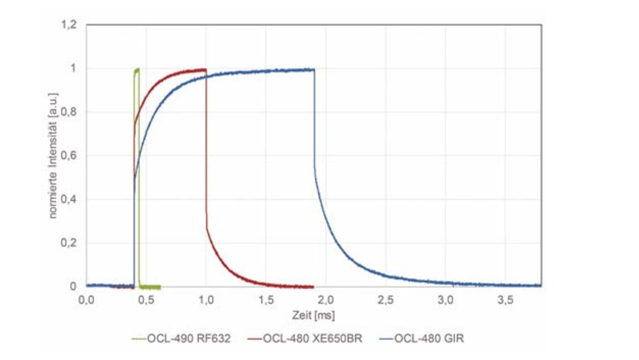 Direkt emittierende LEDs zeichnen sich durch kurze Schaltzeiten aus; beispielsweise hat eine 635-nm-LED mit 1 mm Kantenlänge des Chips bei einem Impulsstrom von 350 mA eine Schaltzeit <0,5 µs. Das ermöglicht eine Synchronisation der LEDs mit dem Kamera-Triggersignal. Ebenso kann in einer derartigen Anordnung ein Teil der LEDs, deren Emission für das konkrete Anwendungsszenario nicht benötigt wird, abgeschaltet werden. Das reduziert den Aufwand für das thermische Management und den Energiebedarf erheblich. Weitere Vorteile dieses Strahlungsquellen-Designs sind die Grundeigenschaften einer LED wie hohe Lebensdauer, Stabilität gegen Vibration und Schock und geringe Empfindlichkeit auf häufiges Ein- und Ausschalten.