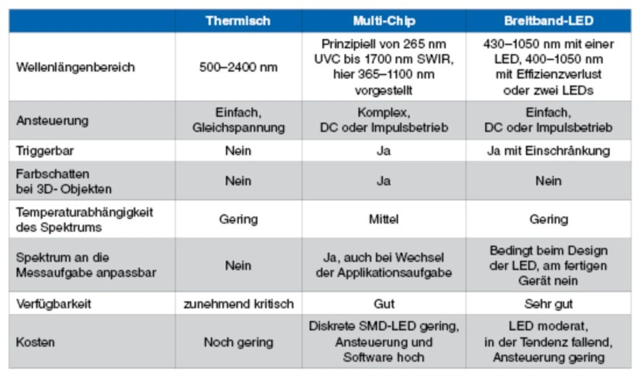 Die hyperspektrale Bildgebung erobert immer mehr Anwendungen. Für die Beleuchtung des Beobachtungsfeldes ist die Wahl der passenden Lichtquelle essenziell. Thermische Strahler, aus LEDs verschiedener Wellenlänge zusammengesetzte Strahler und Strahler aus breitbandigen LEDs im Vergleich.