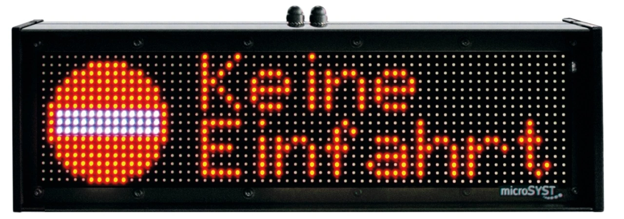 Die visuelle Darstellung entwickelten Contra und Microsyst in enger Abstimmung mit dem Kunden über je eine zeilenorientierte LED-Anzeige pro Entladespur. Mit einer aktiven Displayfläche von 768 mm × 256 mm und nur 80 mm Gehäusetiefe ist der Platzbedarf für die Montage gering. Für unmissverständliche Orientierung sorgen Ziffern, Buchstaben sowie eine Vielzahl individueller Grafiken und Informationstexte, die nach Bedarf dargestellt werden.