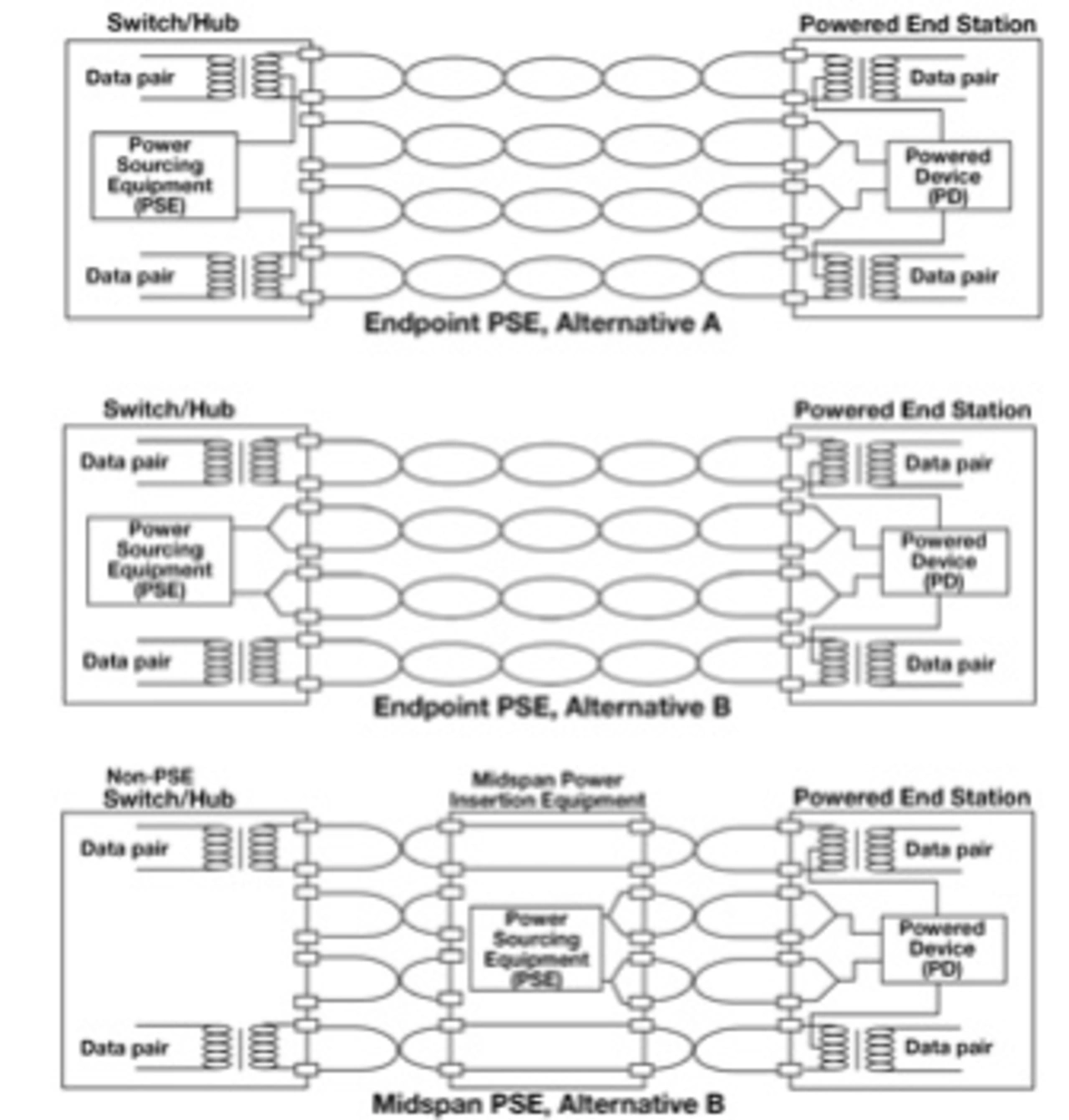 Für PoE wird die erforderliche Differenzspannung von 48 V über Power-Sourcing-Equipment (PSE) an das Ethernet-Kabel angelegt. Befindet sich das PSE im Ethernet-Switch oder -Hub, wird es gemäß IEEE-Standard als Endpunkt-PSE bezeichnet. Der IEEE-Standard nennt für das Endpunkt-PSE zwei alternative Konfigurationen, um im Kabel für einen Stromfluss zu sorgen. Bei Alternative A legt das PSE eine Differenzspannung zwischen den zwei verdrillten Leiterpaaren an, über die die Ethernet-Daten übertragen werden. Hierbei handelt es sich um die einzig mögliche Option, wenn ein CAT5-Kabel mit nur zwei geschirmten verdrillten Leiterpaaren verwendet wird. Bei Alternative B legt das PSE die Spannung zwischen den zwei Reservepaaren an. Diese Methode wird für CAT5e- und aktuellere Kabel mit vier verdrillten Leiterpaaren bevorzugt. Ist das Kabel unterbrochen, sodass das PSE die Spannung zwischen dem Switch bzw. Hub und dem PD-Gerät anlegt, spricht man von einem Midspan-PSE. Diese Konfiguration unterstützt auch die Konfigurationen gemäß Alternative A (Stromfluss im Ethernet-Datenpaar) und Alternative B (Stromfluss im Reservepaar).