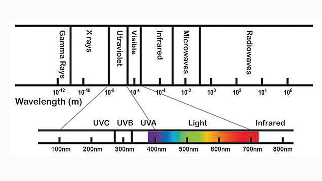 UV-Strahlung reiht sich in das elektromagnetische Spektrum zwischen sichtbarem Licht und Röntgenstrahlung ein. Es umfasst kurzwellige (400 bis 100 nm) Photonen mit entsprechend hohen Energien. Die Wellenlänge der Strahlung ist umgekehrt proportional zur Frequenz: je kürzer die Wellenlänge, desto höher die Frequenz (Bild 1).