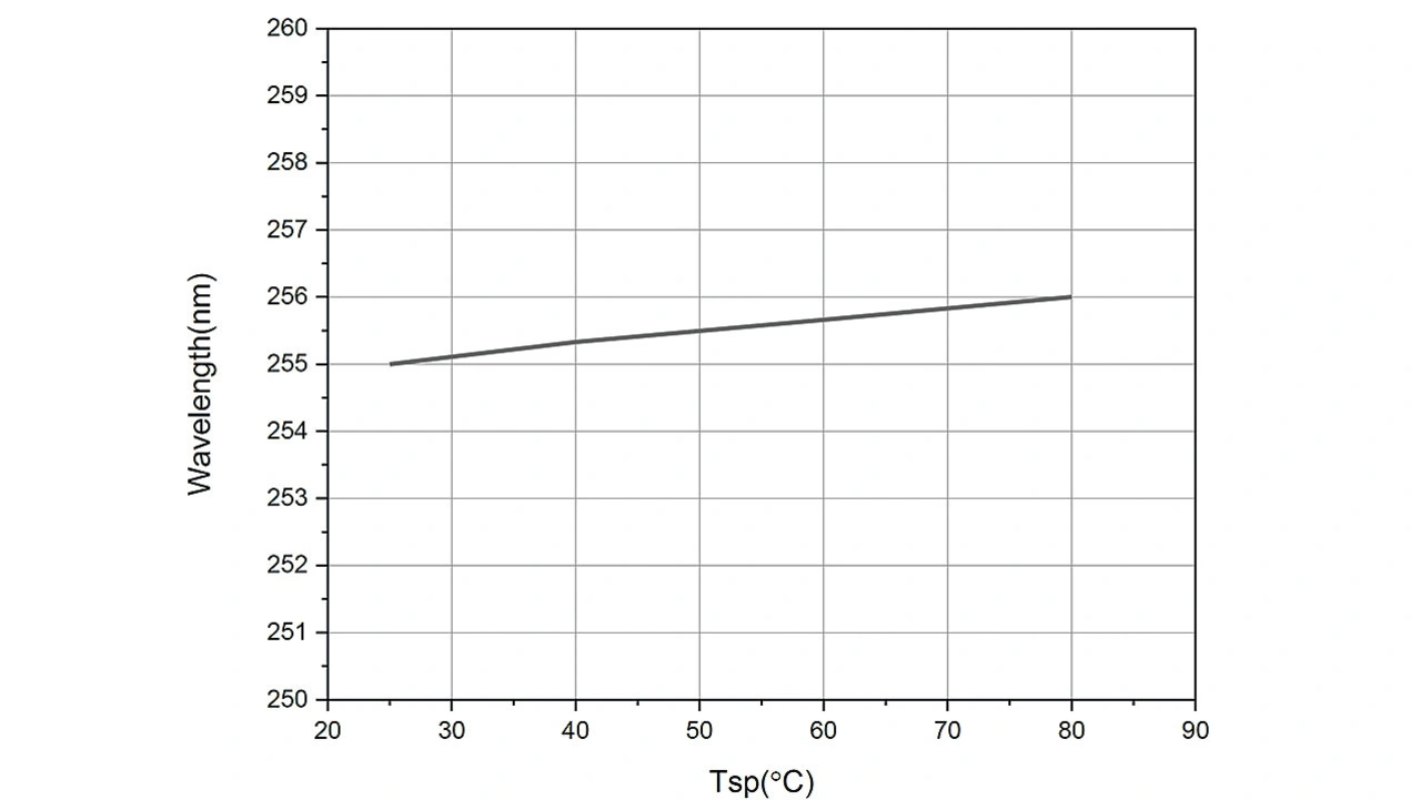 SETi/Seoul Viosys bietet die CUD5GF1B an. Die LED, ein 255-nm-Emitter, ist in einem Keramikgehäuse für die Oberflächenmontage untergebracht und zeichnet sich durch einen geringen thermischen Widerstand aus. Die Strahlungsleistung der Komponente beträgt 7 mW bei einem Ansteuerungsstrom von 200 mA und einer Spannung von 6,5 V. Die LED zeigt eine minimale Abweichung der emittierten Wellenlänge mit steigender Temperatur: Sie weicht über einen Temperaturbereich von 50 ˚C nur um 1 nm von ihrer Spitzenausgabe von 255 nm ab. Dies ist eine wichtige Überlegung für ein Gerät, das eine streng kontrollierte Leistung benötigt, um eine gute Deaktivierung von Viren zu gewährleisten (Bild 5).