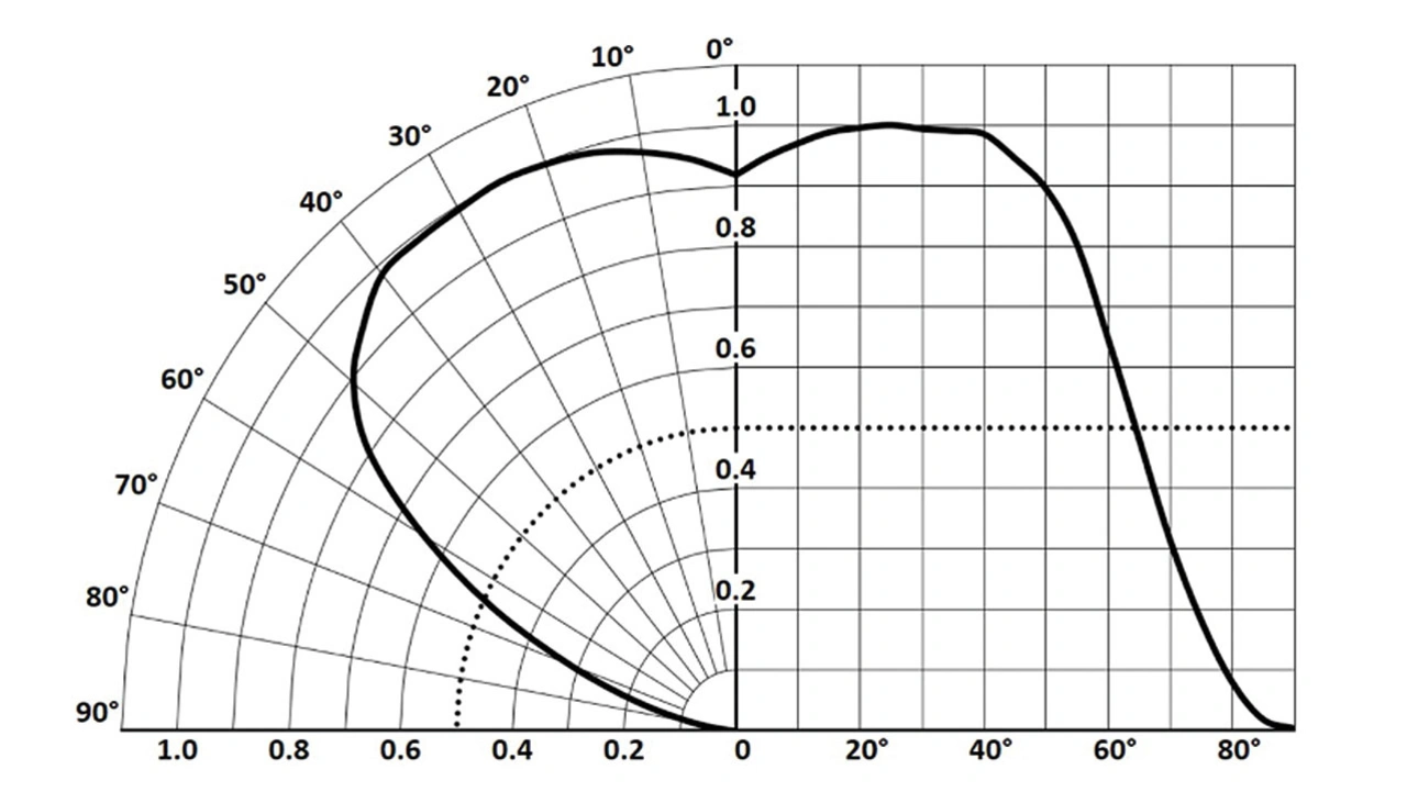 Wird die LED als Punktquelle betrachtet, nimmt die Bestrahlungsstärke nach einem inversen Quadratgesetz ab. Wenn z. B. in 1 cm Entfernung vom Emissions- punkt die Bestrahlungsstärke 10 mW pro Quadratzentimeter (mW/cm2) beträgt, dann ist die Bestrahlungsstärke in 10 cm Entfernung auf 0,1 mW/cm2 gesunken. Diese Berechnung setzt jedoch voraus, dass die LED in alle Richtungen gleichmäßig abstrahlt, was nicht der Fall ist. Stattdessen besitzen LEDs eine Primäroptik, die den Strahlungsfluss in eine bestimmte Richtung lenkt. Die Hersteller geben in der Regel den Abstrahlwinkel der LEDs im Datenblatt an. Dieser ist definiert als der Winkel, bei dem 50 Prozent der Spitzenbestrahlungsstärke auf beiden Seiten des Ursprungs erreicht werden.
