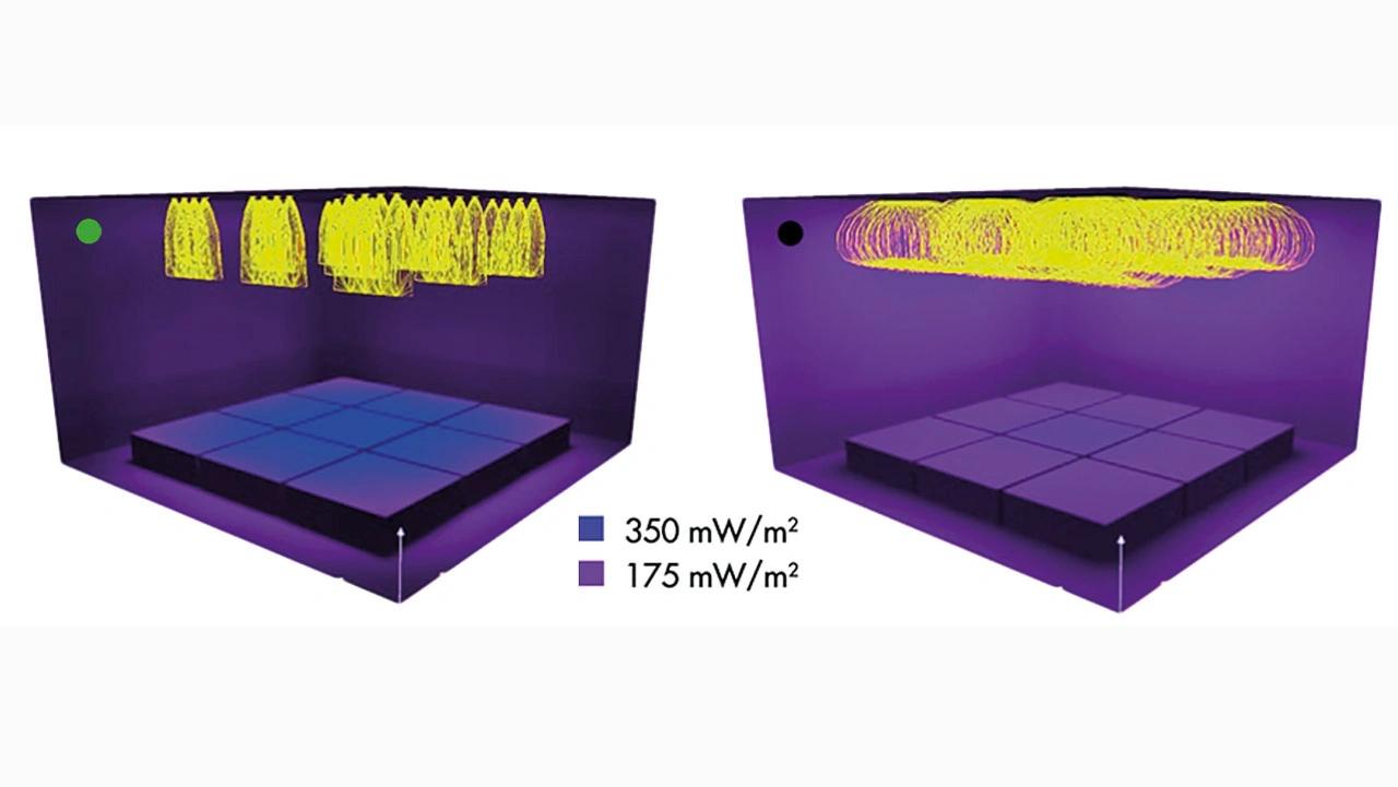 Mit der LED-Leistung, dem Abstand zwischen der LED und der Oberfläche, auf der die zu desinfizierenden Gegenstände sitzen, dem Abstrahlwinkel und den tatsächlichen Emissionsdaten kann der Ingenieur berechnen, wie viele LEDs benötigt werden und wie sie positioniert werden müssen, um die gewünschte Bestrahlungsstärke über der aktiven Fläche zu erzeugen.