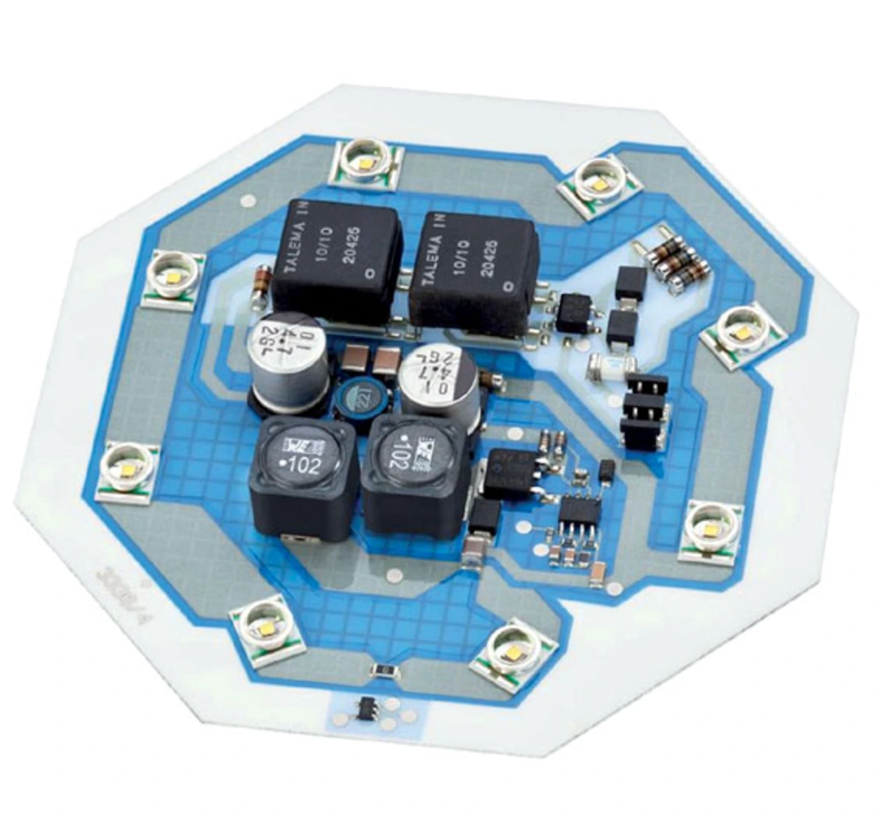 Ein Beispiel für eine Leuchtmittelintegration ist das Hochvoltmodul „Oktagon – 25 Watt" (Bild 6), das einen derartigen Dickschichthybriden verwendet. Die Spannungsversorgung erfolgt direkt mit 230 V Netzwechselspannung.