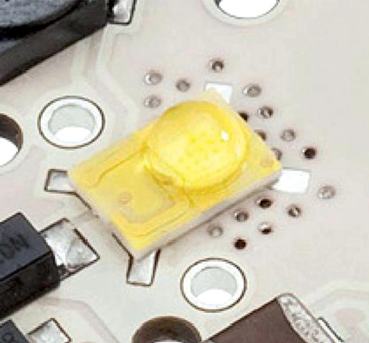 Eine weitere Möglichkeit ist das Aufbringen von LED-Kristallen ohne Gehäuse, was die thermischen Eigenschaften eines Systems ebenfalls verbessert . Beim Verarbeiten von Halbleiter-Chips ohne Gehäuse, der CoB-Technik, kommt hinzu, dass die Ausdehnungskoeffizienten der Halbleiter und der Keramik sehr gut zueinander passen und wenig mechanischer Stress auftritt.