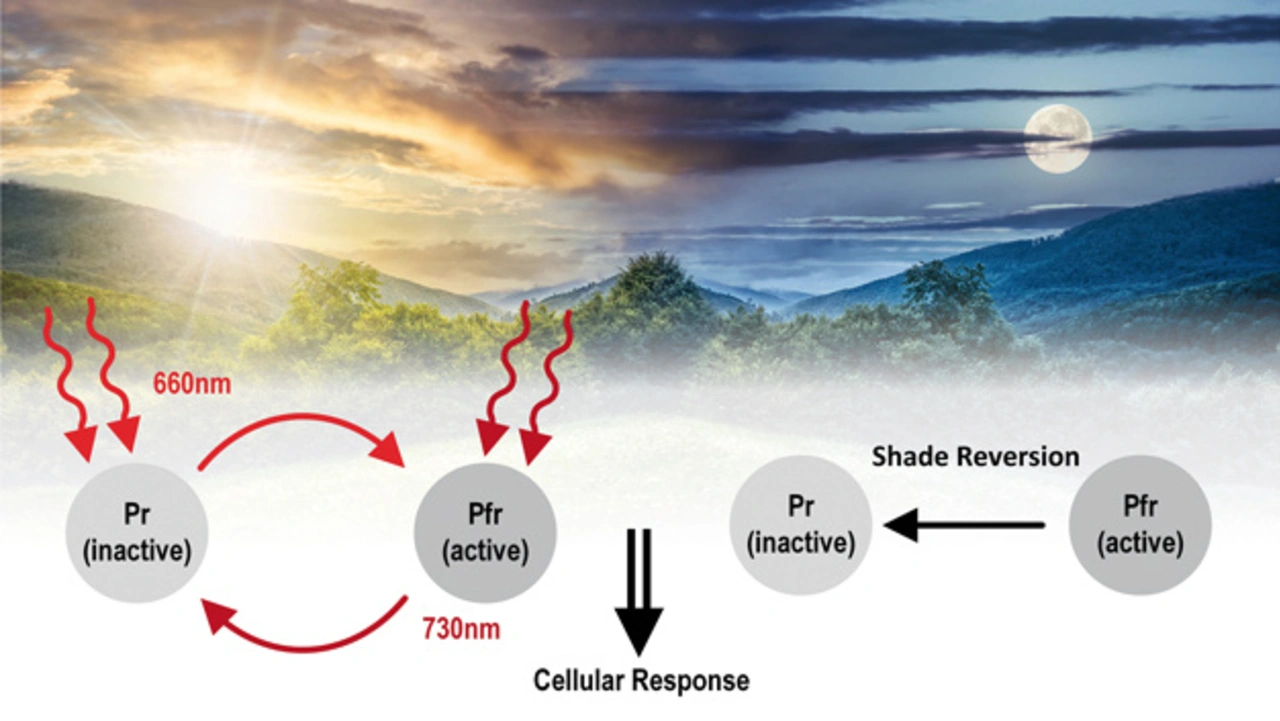 Das System besteht aus zwei Formen von Phytochromen, die sich in ihren absorbierten Wellenlängen unterscheiden: Pr (Phytochromrot) hat ein Absorptionsmaximum bei 660 nm und Pfr (Phytochromdunkelrot; engl: Phytochrom far red) ein Absorptionsmaximum bei 730 nm. Interessanterweise können Pr und Pfr jedoch ihre Molekularstruktur abhängig vom Verhältnis von roten und dunkelroten Wellenlängen reversibel miteinander umwandeln. Pfr-Photorezeptoren gelten als die aktive Form, die in Gegenwart von rotem Licht mit 660 nm aus der Pr-Form umgewandelt wird. Pfr ist physiologisch aktiv und löst biologische Reaktionen aus, ist aber instabil. Das heißt, bei vermindertem oder fehlendem Licht von 660 nm kehrt es in die Pr-Form zurück. Die Pfr-Form wird auch in Gegenwart von dunkelrotem Licht mit 730 nm in die inaktive Pr-Form umgewandelt. Daher beeinflusst das Verhältnis (Lichtqualität) neben der Belichtungszeit (Photoperiodismus) und der Gesamtmenge (Lichtintensität) von roten und dunkelroten Wellenlängen, denen eine Pflanze ausgesetzt ist, das Phytochrom-System. Unterschiedliche Verhältnisse von Rot-/Dunkelrot-Wellenlängen können biologische Signalwege auslösen, die die gewünschten Eigenschaften von Pflanzen signifikant beeinflussen können.