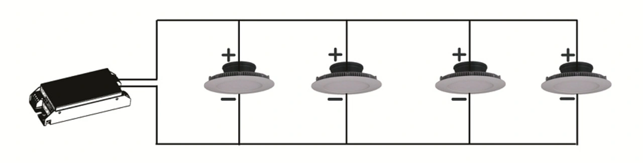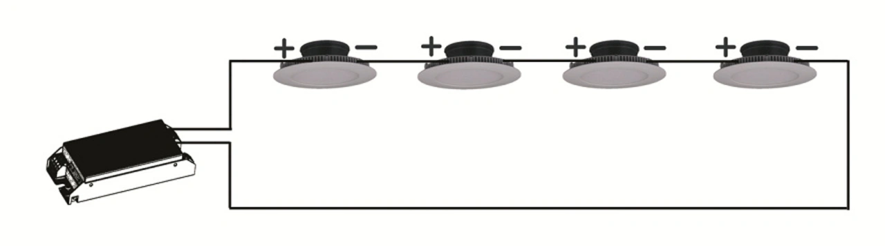 Bei Leuchten die auf der LED-Platine keine zusätzlichen Widerstände in den einzelnen LED-Gruppen haben, muss der Strom durch den LED-Treiber begrenzt werden. Vereinfacht darstellen lässt sich dies durch mehrere in Reihe geschaltete Leuchten, die durch ein gemeinsames LED-Betriebsgerät mit Energie versorgt werden sollen (Bild 1).