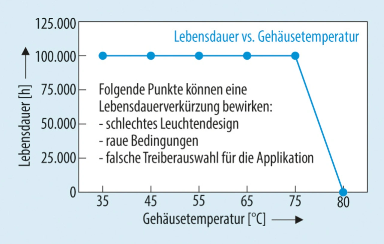 Nachdem die elektrischen Parameter der Leuchte festgelegt sind, sollte die Platzierung des Betriebsgerätes im Hinblick auf eine ausreichende Kühlung betrachtet werden. Die Lebensdauer eines LED-Treibers ist direkt von der Gehäusetemperatur (Tc) des Betriebsgerätes abhängig. In den Datenblättern der LED-Treiber gibt es hierzu entsprechende Tc/Lifetime-Diagramme (Bild 3).