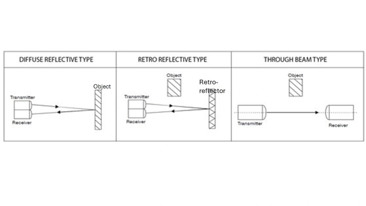 Die PE-Näherungssensorik beruht auf einer Lichtquelle mit einem eng gebündelten Strahl, der auf das zu erfassende Objekt gerichtet ist. Dieser Lichtstrahl wird auf eine von drei Arten verwendet, je nachdem, wie er von einem Empfänger erfasst wird (Bild 1).