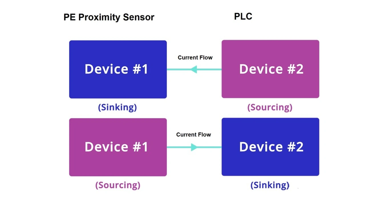 Der digitale Ausgang der W10-Sensorkomponenten ist ein wichtiger Aspekt der Konstruktion. Die Komponenten bieten eine einstellbare Gegentakt-PNP/NPN-Ausgangsstruktur. Ist der Ausgang auf PNP eingestellt, hat er ein positives Ausgangssignal und der Ausgang des Sensors kann Strom für eine stromaufnehmende Eingangskarte liefern. Ist der Sensor auf NPN eingestellt, ist das Ausgangssignal negativ und der Ausgang kann Strom von einer stromliefernden Eingangskarte aufnehmen (Bild 5). Beide Optionen gewährleisten eine grundlegende Kompatibilität der Signalebene mit einer SPS oder anderen Systemsteuerungen.