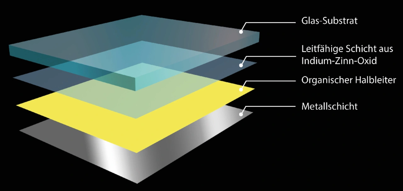 Grundsätzlich besteht eine OLED aus mehreren hauchdünnen Schichten, wobei jede Schicht eine Dicke von einigen zehn bis hundert Nanometern aufweist. In Bild 3 ist das Grundkonzept einer OLED dargestellt. Als Trägermaterial wird ein Glas-Substrat verwendet, die Stromversorgung erfolgt über eine transparente leitfähige Schicht, beispielsweise aus dem Material Indium-Zinn-Oxid (Indium-Tin-Oxide, ITO). Aus organischen Materialien besteht hingegen die lichterzeugende Schicht. Die Gegenelektrode oder Kathode, die nicht transparent sein muss, wird aus Metall hergestellt, beispielsweise Aluminium oder Silber. In Richtung der beiden transparenten Schichten (Glas und ITO) kann das Licht emittieren, in Richtung des Metalls wird das Licht jedoch aufgrund des Aufbaus geblockt. Mit einer solchen Schichtanordnung auf Folien sind extrem dünne und auch biegsame Displays möglich. So wurde ein Display unter 0,3 mm Dicke präsentiert [1].
