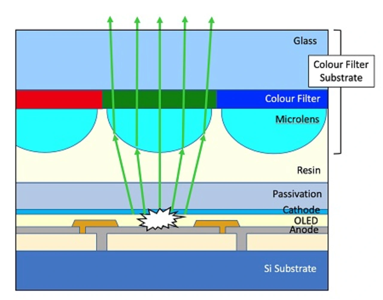 Weiterhin konnte Sony Semiconductor Solutions die Lichtauskopplung durch den Einsatz eines neuen Kathodenmaterials deutlich verbessern. Anstatt einer Magnesium-Silberlegierung hat der Hersteller eine hochtransparente und sehr leitfähige Zinkoxid-Legierung verwendet. Damit ist beispielsweise bei einer Wellenlänge von etwa 450 nm die ausgekoppelte Lichtintensität um den Faktor 1,6 besser. Da sich das neue Kathodenmaterial auf verschiedene Wellenlängen unterschiedlich auswirkt, müssen die Transmissionseigenschaften der Farbfilter entsprechend angepasst werden. Über das gesamte Spektrum hinweg ist es durch die Änderung des Kathodenmaterials möglich, die Lichtauskopplung insgesamt um den Faktor 1,3 zu verbessern.