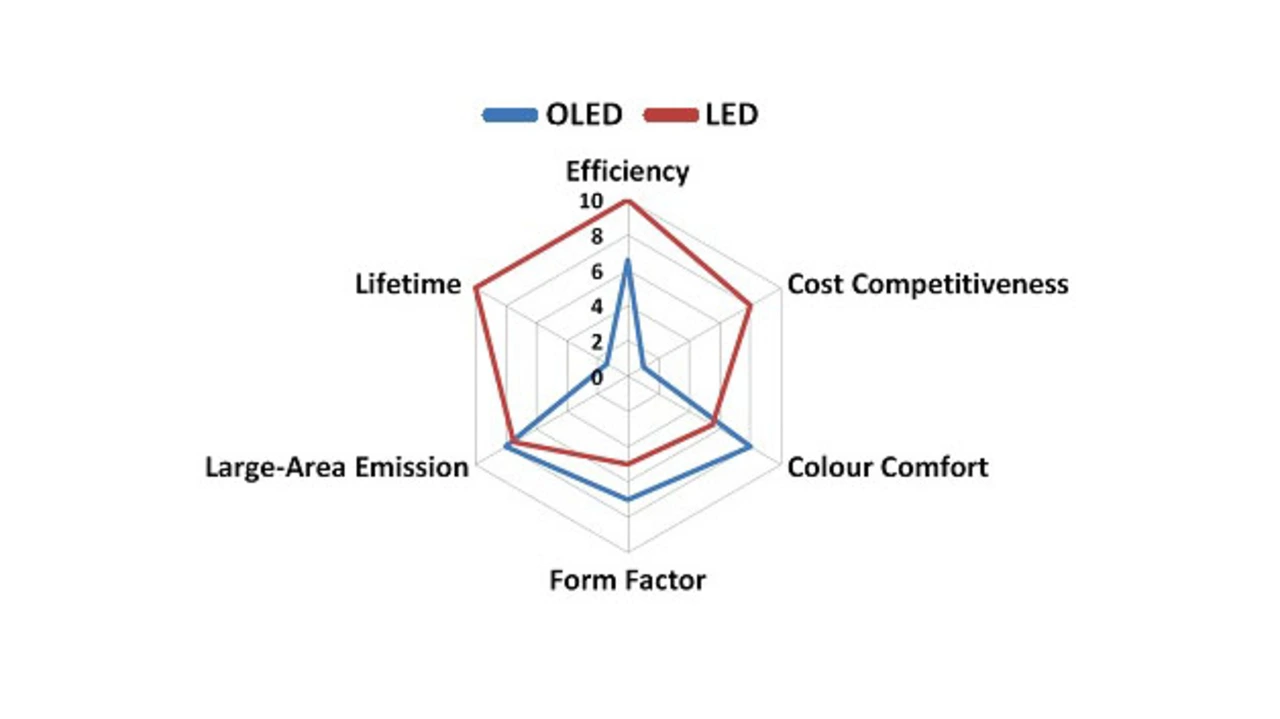 Die LED ist insgesamt also ausgereifter als die OLED, was aufgrund der längeren Entwicklungszeit auch klar ist. Bis die OLED-Beleuchtung zu einem nennenswerten Markt wird, sind also noch einige technische und vor allem wirtschaftliche Verbesserungen notwendig. Die einzelenen Vorteile die OLEDs derzeit bieten, reichen nicht aus, um etwa die hohen Kosten oder die geringerer Effizienz im Vergleich zu den LEDs auszugleichen. OLED-Hersteller werden also viel Geduld benötigen. Es sei denn, jemand findet einen Weg die derzeitigen schneller als erwartet zu verbessern.