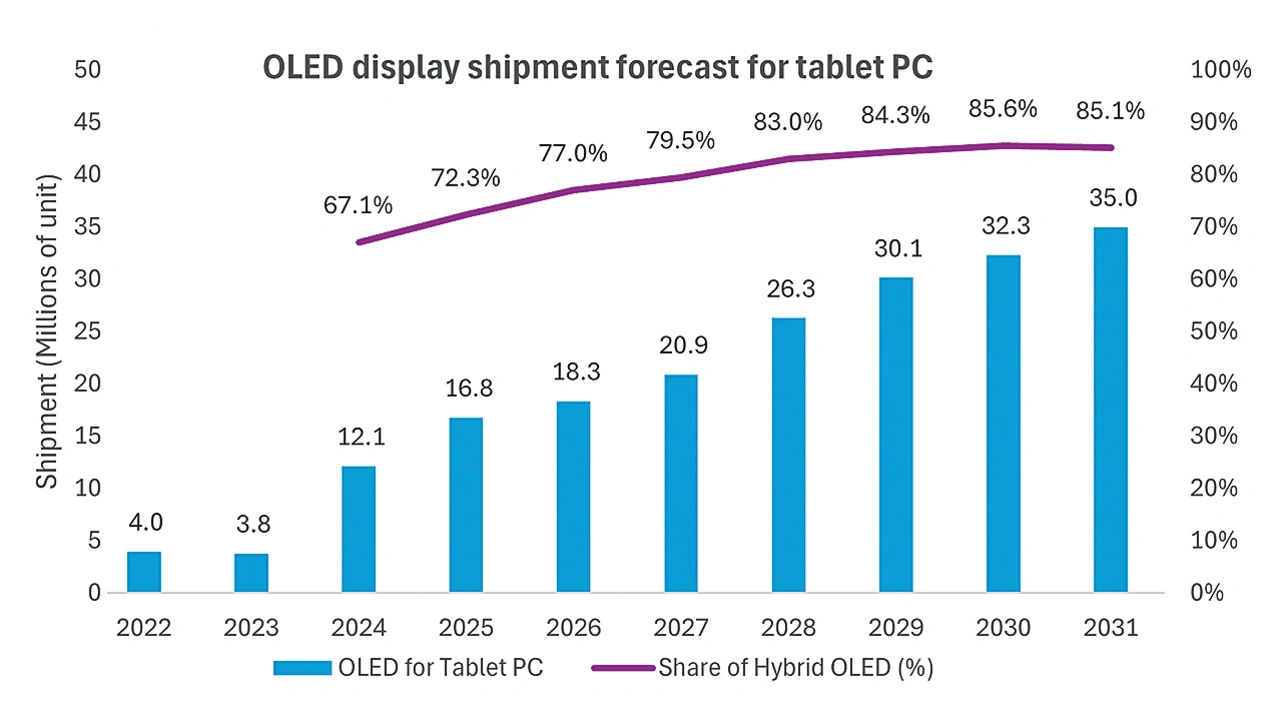Ganz ähnliche Tendenzen sind im Bereich der mobilen Geräte zu verzeichnen. Hatten OLED-Displays etwa bei Tablet-PCs im vergangenen Jahr mit 3,8 Millionen Stück noch einen Marktanteil von unter 5 Prozent, soll sich dieser 2024 mit 12,1 Millionen verbauten Einheiten fast verdreifachen. Nach den Prognosen von Omdia werden in drei bis vier Jahren mehr als die Hälfte der Tablets mit OLED-Panels ausgestattet sein, bis 2031 soll ihr Marktanteil auf mehr als 85 Prozent ansteigen.
