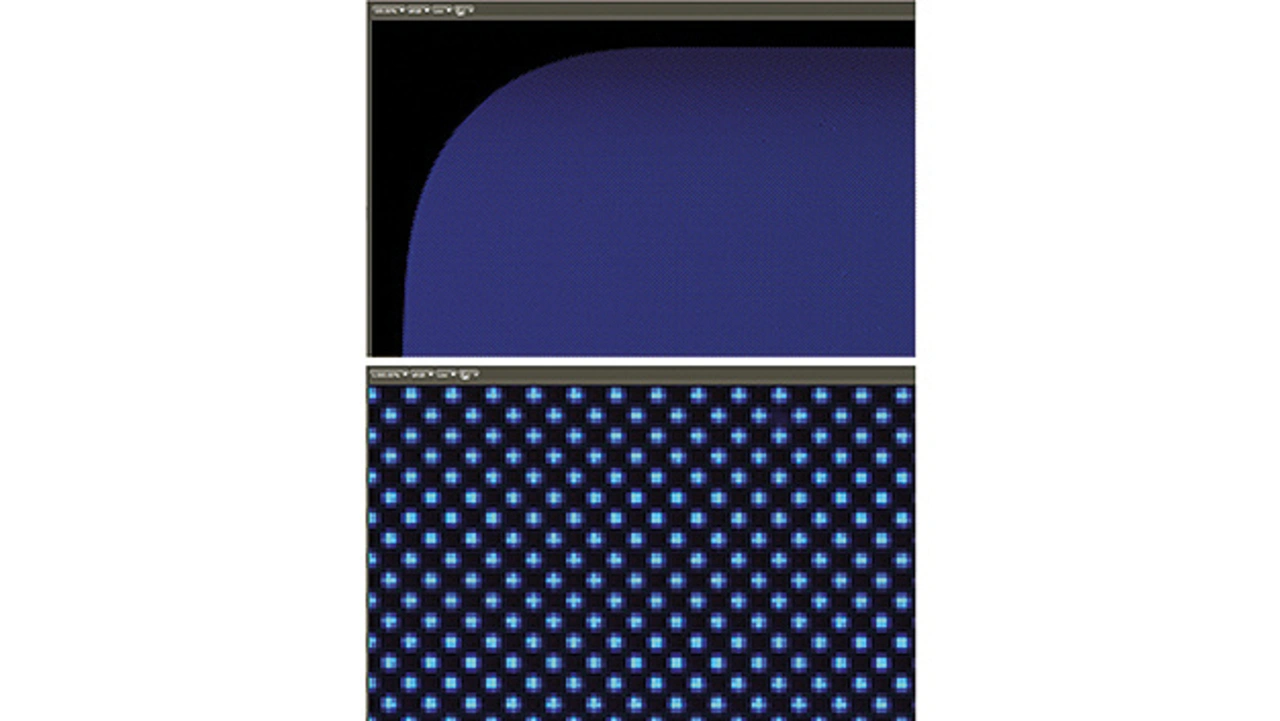 Für die absolute Messung wurde das Display eines OLED-Handys aufgenommen. Bild 2 zeigt zwei Aufnahmen des Blue-Screens in verschiedenen Zoomstufen (2x2-Aufnahmen). Jedes einzelne blaue OLED-Pixel des gesamten Displays kann mit ausreichender Auflösung für eine genaue Farb- und Leuchtdichte-Bewertung erfasst werden. Auf Grundlage dieser Daten erstellt ein speziell entwickelter Algorithmus eine Pixelkarte mit Farb- und Luminanz-Werten. Diese Informationen können dann für weitere Analysen oder die Kalibrierung des Bildschirms verwendet werden (Demura im Falle von OLED-Displays).