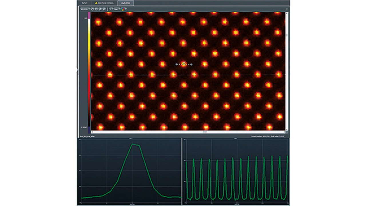 Die Anzahl der Pixel-Shift-Messungen kann je nach Auflösung des zu prüfenden Gerätes angepasst werden. Bild 3 zeigt die Leuchtdichteverteilung in Pseudo- farbdarstellung desselben Displays, jedoch mit 2400 Megapixeln pro Bild (4x4-Sampling). Es ist deutlich zu erkennen, dass eine sehr detaillierte Analyse für jedes blaue Subpixel möglich ist. Im oberen Teil der Abbildung sind zwei Linien zur Bewertung der lateralen Verteilung der Leuchtdichte eingetragen – gestrichelt über ein Subpixel und gepunktet über 15 Subpixel. Das Diagramm unten links zeigt die Leuchtdichteverteilung entlang der Linie parallel zur x-Achse für ein einzelnes Pixel. Das Profil unten rechts umfasst insgesamt 15 blaue Subpixel zum Vergleich. Über weitere Analyse-Tools wie Spotmeter sind in der LumiSuite-Software Berechnungen für gemittelte Leuchtdichte- oder Farbinformationen, Histogramme und Homogenität verfügbar.