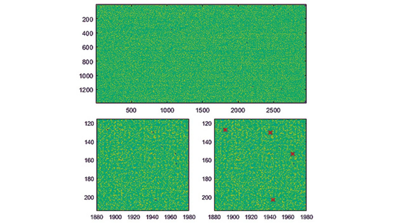 Einige Analysen – wie die Erkennung von Pixelfehlern oder Mura-Messungen – benötigen keine absoluten Messungen von Farbe und Leuchtdichte. Für diesen Zweck wurde ein besonders schneller Algorithmus entwickelt. Dieser ermöglicht die Analyse ganzer Displays in einer einzigen Messung mit der LumiTop X150. Der Algorithmus erzeugt eine Pixel-Intensitätskarte (Bild 4, oben) und der Benutzer kann zur Erkennung von Pixelfehlern Pass/Fail-Kriterien einstellen. Die zwei Bilder in Bild 4 unten sind gezoomte Ausschnitte. Die roten Kreuze im rechten unteren Bild markieren defekte Pixel gemäß den gesetzten Kriterien, hier von 30% Leuchtdichteabweichung im Vergleich zu den benachbarten Pixeln.