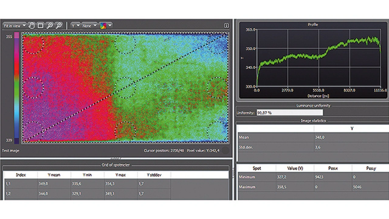 Bild 5 zeigt die Leuchtdichteverteilung in Pseudofarbdarstellung für ein weiß anzeigendes OLED-Tablet. Über die Diagonale ist ein Linienprofil festgelegt (von unten links nach oben rechts). Das dazugehörige Diagramm (Bild 5 oben rechts) zeigt einen deutlichen Luminanzabfall entlang dieser Linie. Zusätzlich wurde ein Raster aus neun Spots auf dem Bild platziert, um Informationen über die maximale, minimale und durchschnittliche Leuchtdichte sowie Farbe innerhalb der Spots zu erhalten. Diese Ergebnisse werden tabellarisch dargestellt.
