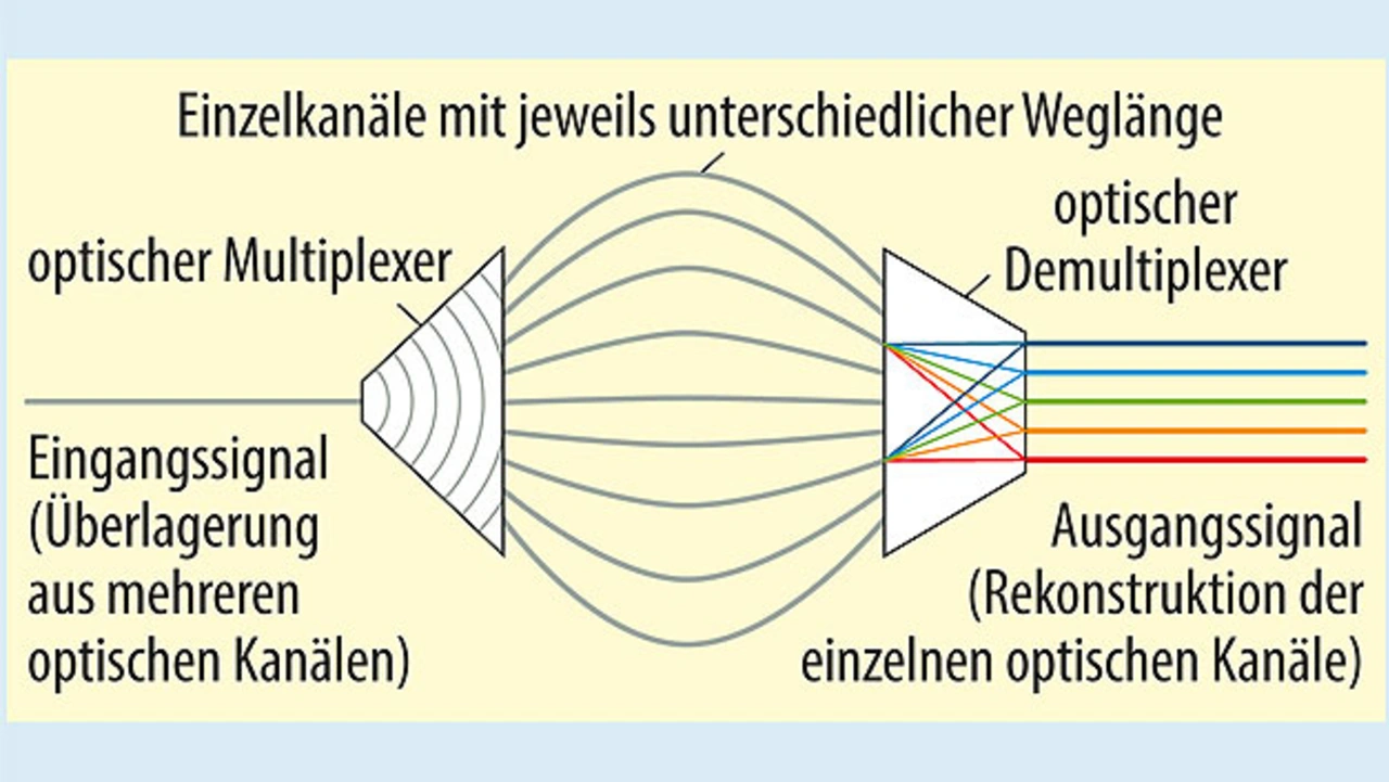 Multiplexer und Demultiplexer für DWDM, die konventionell mit Beugungsgittern in Freistrahloptik umgesetzt werden, verkleinern sich um den Faktor 10, wenn sie planar in Form eines »Arrayed Waveguide Grating« (AWG) hergestellt werden (Bild 6). Die Abmessungen schrumpfen damit auf wenige Millimeter bei gleichzeitig deutlich besserer Auflösung. Das Gitter spaltet das eintretende optische Signal in viele einzelne Kanäle, die im Bogen geführt werden und somit verschiedene Weglängen zurücklegen. Am Ausgang laufen alle Kanäle wieder zusammen und infolge von Interferenz trennen sich die einzelnen Wellenlängen in unterschiedliche Richtungen auf.
