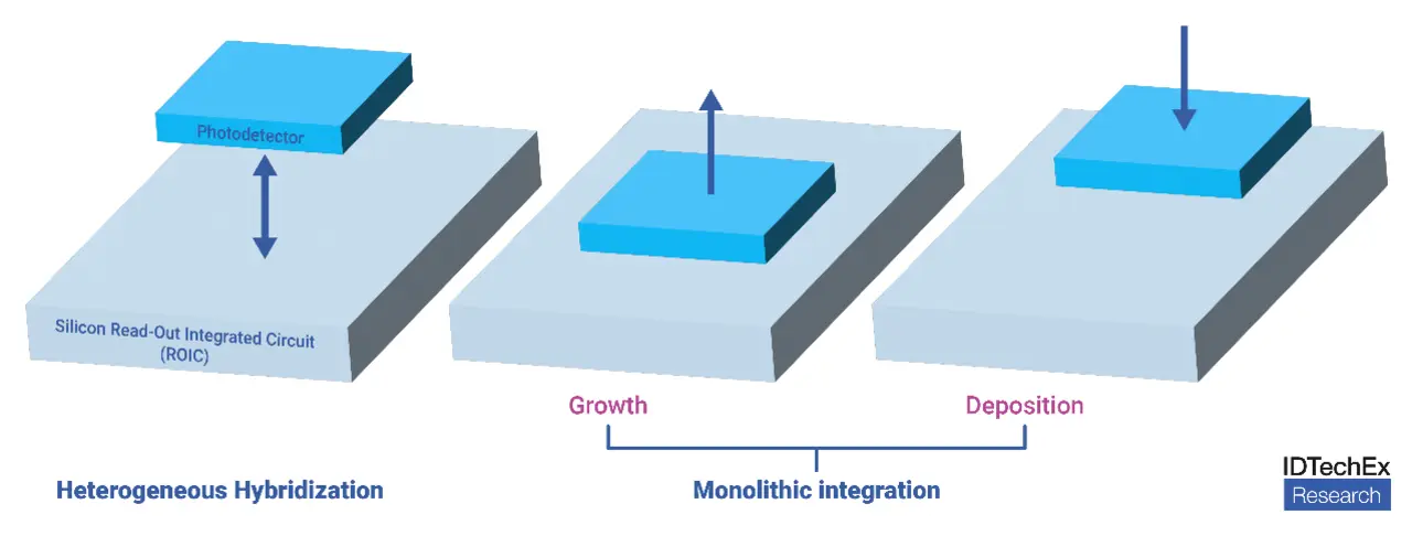 Derzeit werden integrierte Silizium-Leseschaltung Readout-ICs (ROICs) aus Silizium verwendet, während für die Fotodetektoren alternative Halbleiter gesucht werden müssen. Die Kombination von Silizium-ROIC und Photodetektor über die heterogene Integration kann über drei mögliche Wege erreicht werden.