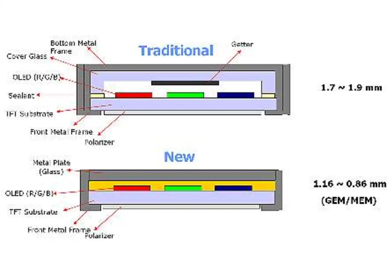Auch das Modul-Design von OLEDs lässt sich optimieren, wie CMEL mit seinem MEM- (Metal-Encapsulated-Module) bzw. GEM-Design (Glass-Encapsulated-Module) zeigt: Dabei verschwindet der vorhandene Hohlraum und erlaubt eine noch dünnere Ausführung der Module. Die eingebrachten Materialien und die Glas/Metallrückwand optimieren zudem die thermischen Eigenschaften und erreichen dadurch eine längere Lebensdauer der Zellen.