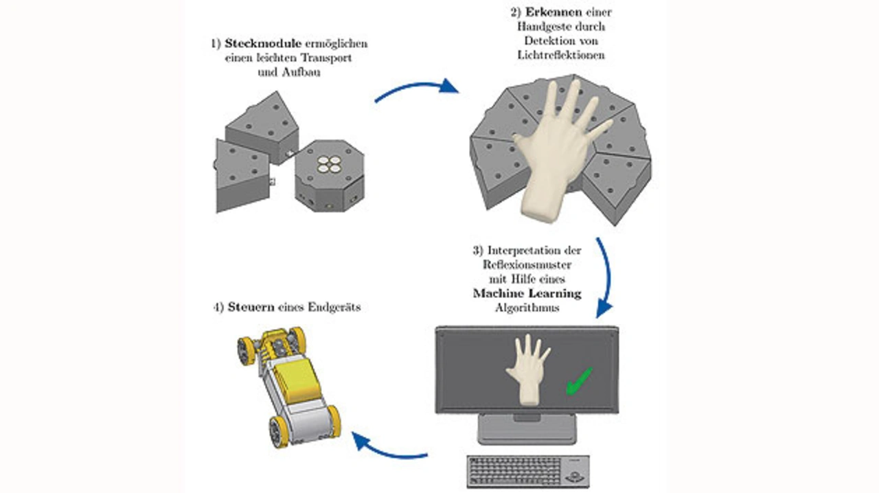 Bei dem Gestikulaser (Bild 2) handelt es sich um ein neues Gestenerkennungssystem. Es erkennt statische Handgesten eines Menschen, die dadurch zur Interaktion mit einem Endgerät genutzt werden können. Hierbei werden infrarote Lichtsignale einer LED detektiert, die von der Hand des Nutzers reflektiert werden, während er eine Geste ausführt. Dazu wandeln Photodioden das einfallende Licht in Photoströme um, die über einen Mikrocontroller an einen Computer weitergeleitet und dort von einem Python-Skript verarbeitet werden. Das Skript erkennt die durchgeführte Handgeste mit Hilfe eines zuvor antrainierten künstlichen neuronalen Netzes. Nach der Auswertung wird die erkannte Geste genutzt, um ein Endgerät anzusteuern.