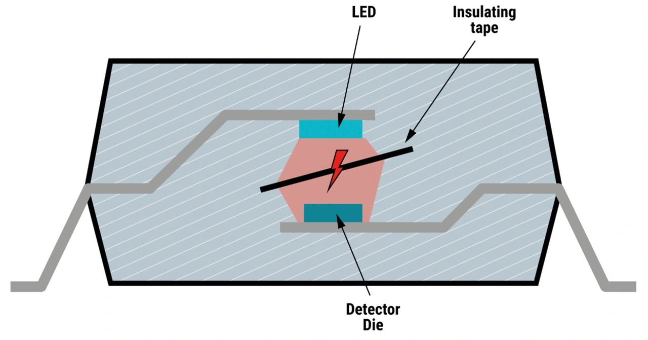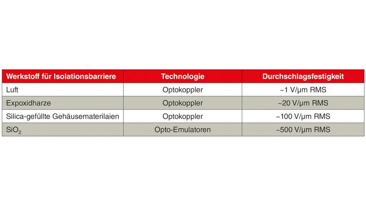 Optokoppler vereinen typischerweise eine LED und einen Fototransistor oder eine Fotodiode in einem Gehäuse und tauschen digitale oder analoge Informationen über eine Isolationsbarriere aus. Diese Isolationsbarriere kann ein einfacher Luftspalt oder auch ein durchsichtiges Epoxidharz sein. Und hier liegt schon der erste Nachteil: Isolationsmaterialien in Optokopplern weisen eine relativ geringe Durchschlagsfestigkeit auf (s. Tabelle).