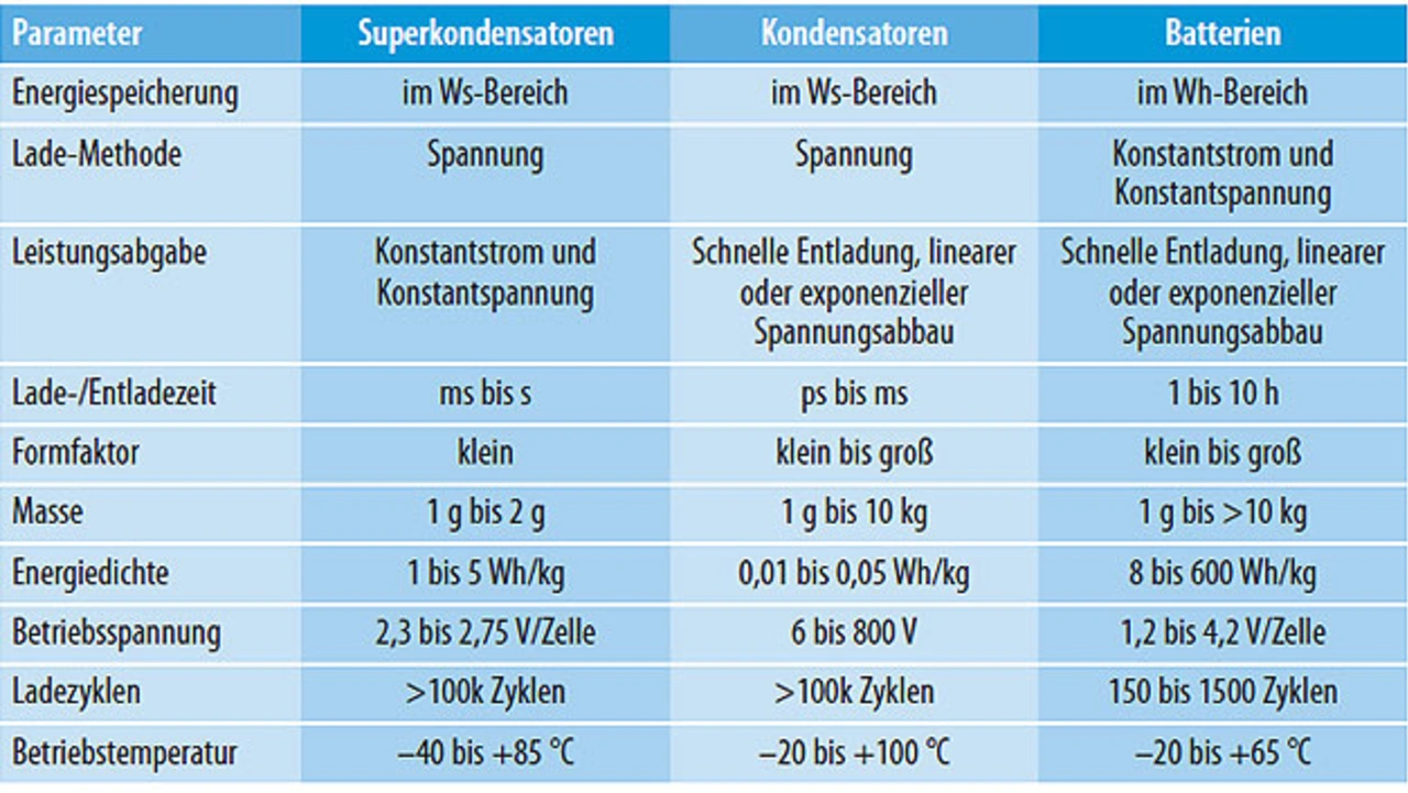 Auf der anderen Seite können Batterien viel Energie speichern, sind aber in der Leistungsdichte und -bereitstellung begrenzt. Bedingt durch ihre chemischen Eigenschaften weisen sie aber eine begrenzte Zahl an Lade-/Entladezyklen auf. Deshalb sind sie vor allem dann gut geeignet, wenn geringe Energie über einen langen Zeitraum geliefert werden soll, denn hohe Entladeströme reduzieren die Betriebsdauer drastisch. Die Tabelle zeigt einen Vergleich der Eigenschaften von Superkondensatoren, Kondensatoren und Batterien.