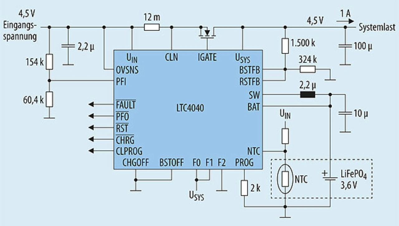 Beim LTC4040 (Bild 1) handelt es sich um ein komplettes Backup-Power-Management-System für Lithium-Batterien, das 3,5 oder 5 V dauerhaft bereitstellen kann, falls das Netz ausfällt.