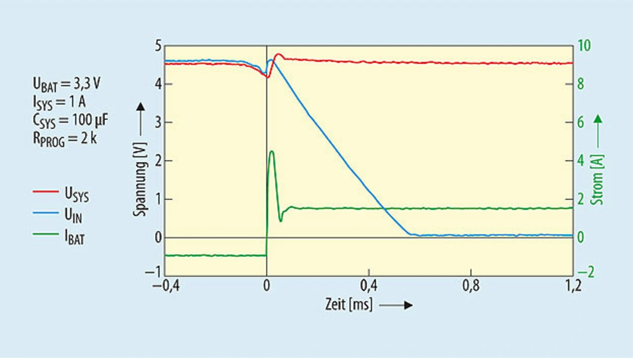 In Bild 3 ist der Übergang vom Normal- zum Backup-Betrieb in einer Anwendung mit LiFePO4-Batterie dargestellt.
