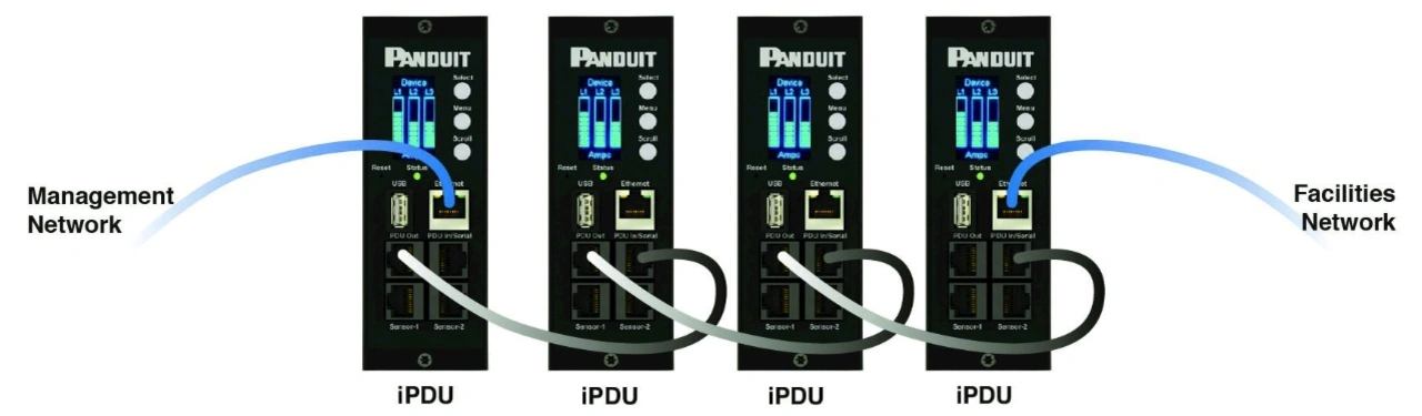Die intelligenten Gen-5-iPDUs von Panduit kommen in Betracht, um die Anforderungen an Stromverteilung, Verfügbarkeit, Sicherheit und Überwachung von Cloud-Installationen zu erfüllen. Gen-5-iPDUs haben eine Betriebstemperatur von 60 °C bei Volllast. Sie verfügen außerdem über Sensoreingänge, um die ASHRAE-Anforderung von 3T + H im Kaltgang und einen Temperatursensor im Warmgang ohne zwischengeschaltetes 1RU-Gerät zu erfüllen. Digitale, sich selbst identifizierende Sensoren können direkt in die iPDU eingesteckt werden, was die Bereitstellung beschleunigt.