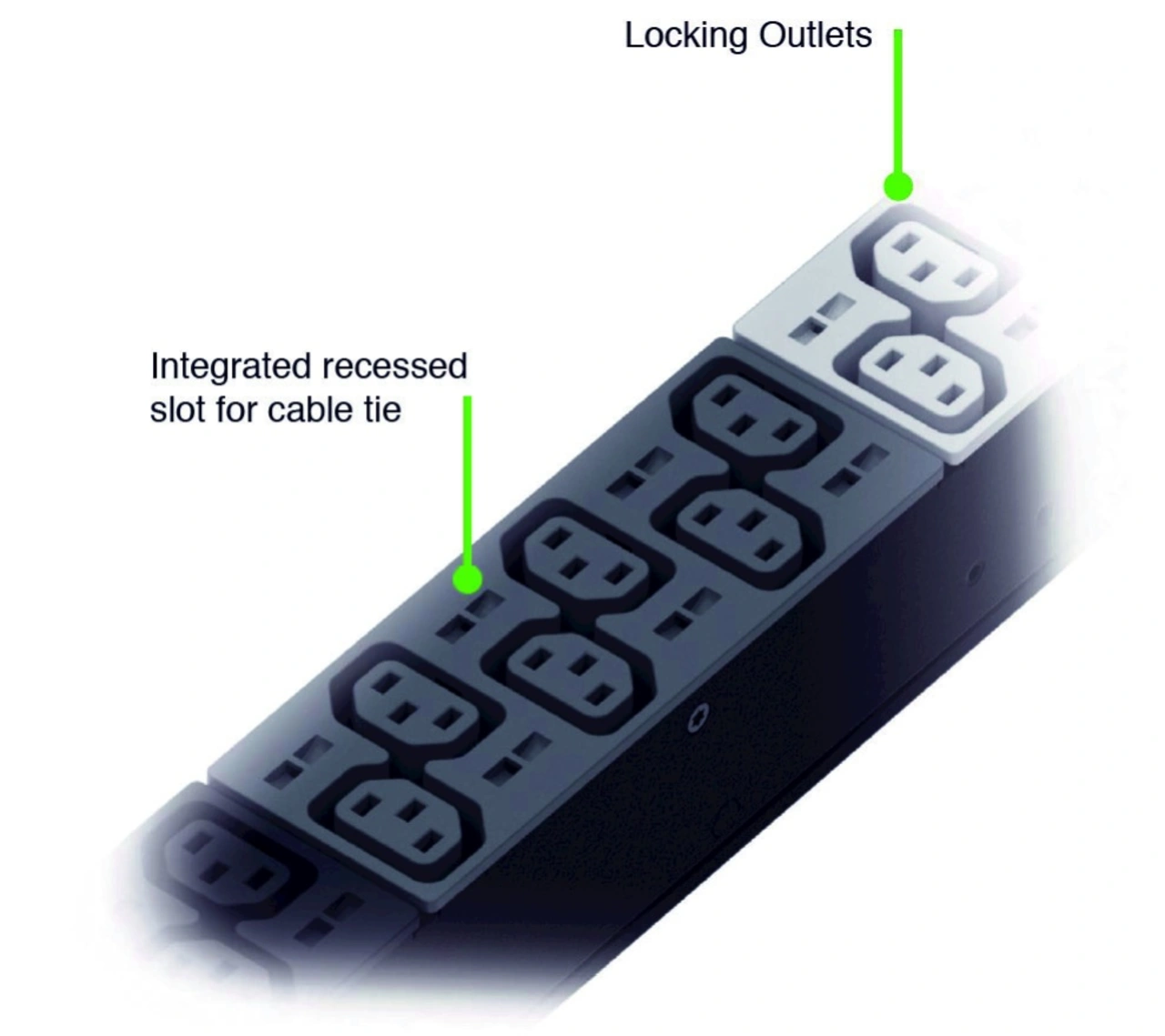 Entwickler, die Gen-5-iPDUs verwenden, können zwischen zwei verschiedenen Lösungen für das Problem versehentlicher Verbindungsabbrüche wählen. C13- und C19-Standardsteckdosen verfügen über einen integrierten, vertieften Schlitz zur Aufnahme eines nicht leitenden Kabelbinders, der die Auswirkungen von Vibrationen und Schwerkraft effektiv ausschaltet. Diese Steckdosen sind zwar preiswerter, aber die Verwendung von Kabelbindern ist mit Arbeitskosten verbunden, und das Netzkabel wird auf der Geräteseite nicht gesichert. Die iPDUs der Generation 5 sind mit verriegelbaren Kabeln erhältlich, die sicher einrasten und so eine umfassendere Lösung bieten. Darüber hinaus verfügt das Geräteende über einen universellen Verriegelungsmechanismus, der sich mit dem IT-Gerät verbindet und für eine dauerhafte Kabelbefestigung an beiden Enden sorgt.