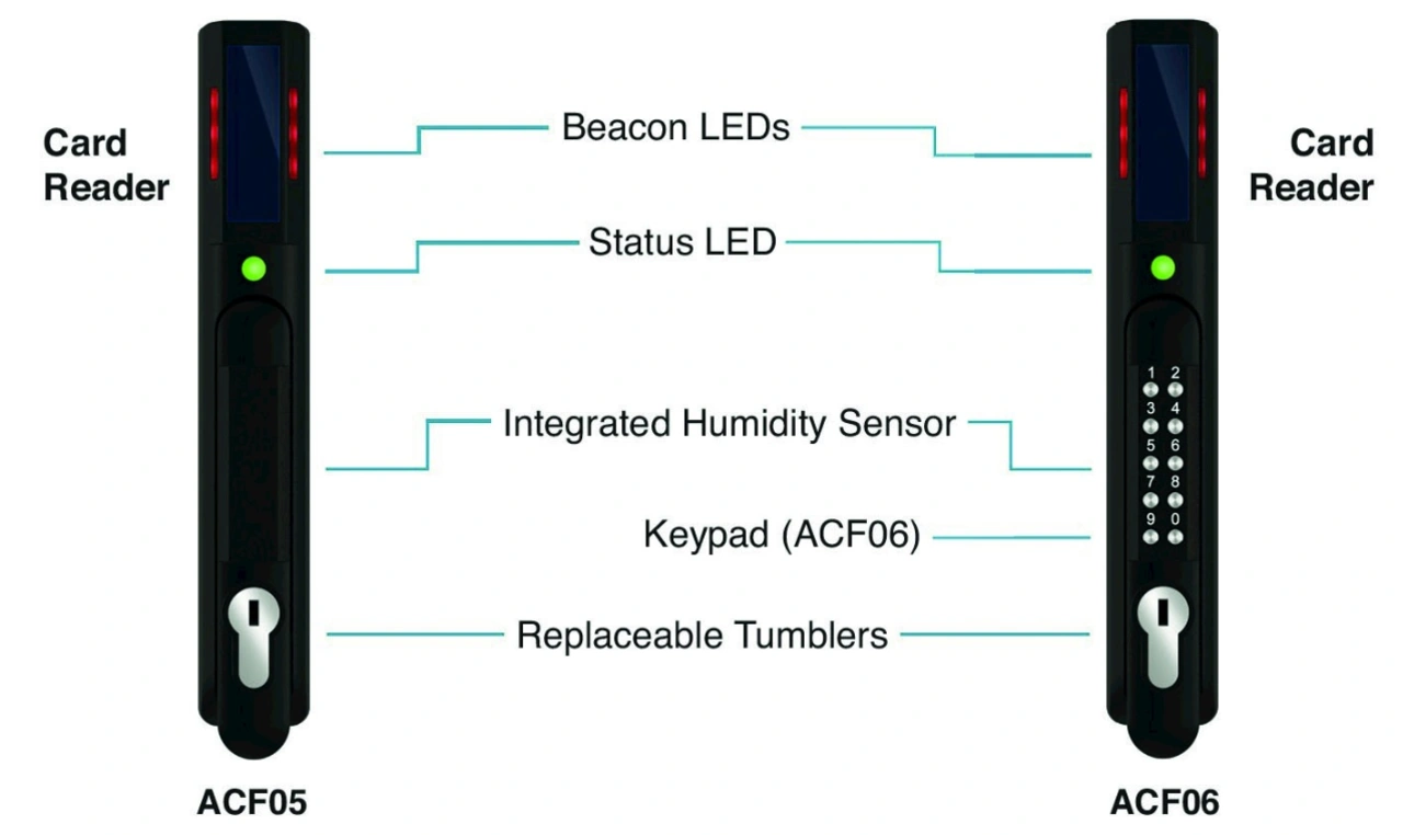 Um eine Zugangskontrolle für bis zu 200 Benutzer zu ermöglichen, gibt es den optionalen Sicherheitsgriff Panduit Smart Zone G5, der sich mit der Gen-5-iPDU verwenden lässt. Dieser Griff verfügt über eine LED, die den Sicherheitsstatus des Griffs anzeigt, und eine Leuchtanzeige-LED, die den Zustand des Gehäuses anzeigt. Außerdem verfügt er über einen integrierten Feuchtigkeitssensor und spezielle Temperatur- und Türalarmsensoren, die die Installation der Sensoren vereinfachen und die ASHRAE-Normen erfüllen. Der G5-Sicherheitsgriff umfasst vor Ort austauschbare Schlosszuhaltungen und Schlüssel sowie vier Möglichkeiten, den Zugang zum Schrank zu kontrollieren: