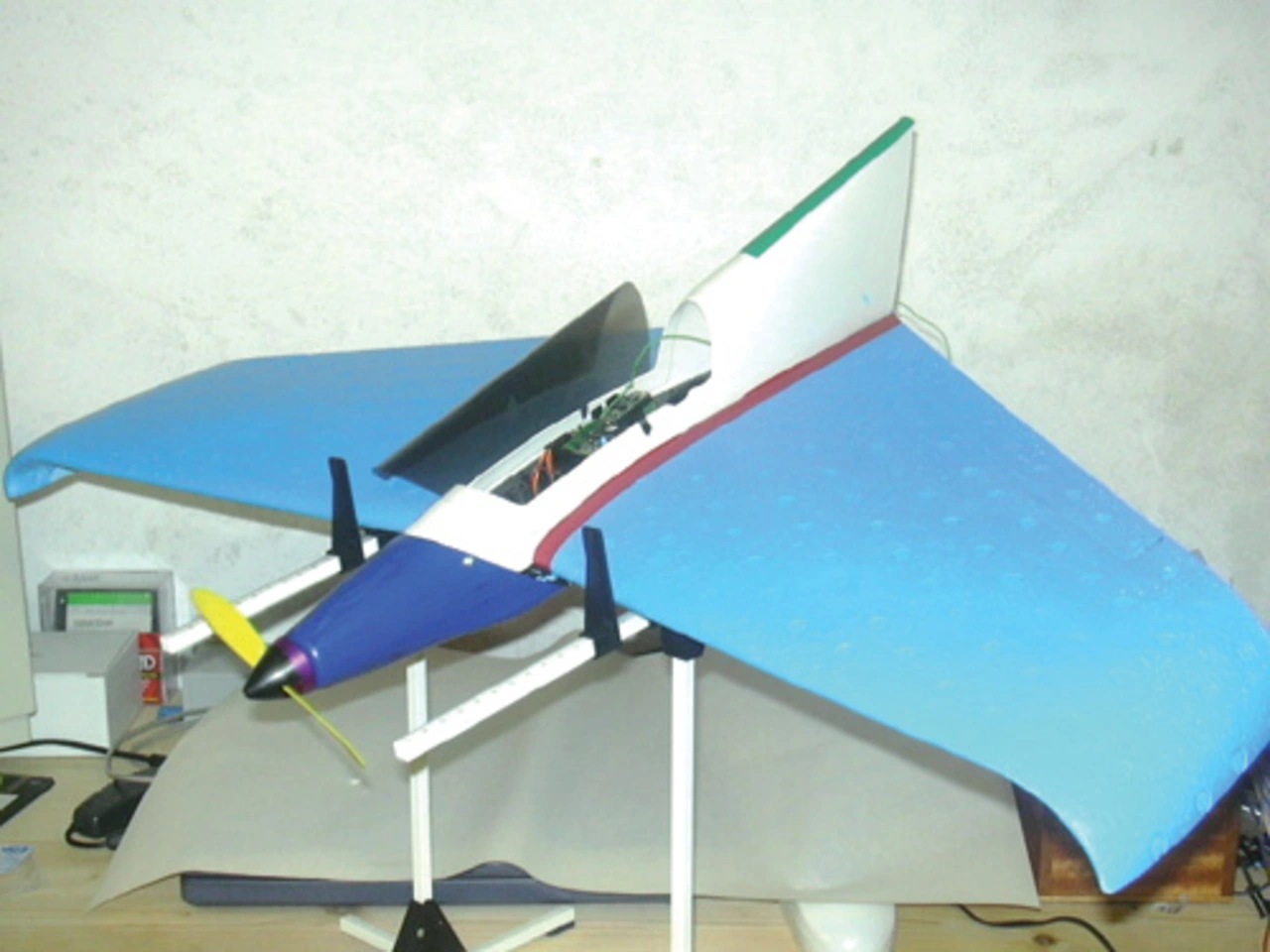 Für die Realisierung wird das Flugzeugmodell „Bat“ der Fa. Act [6] verwendet. Das futuristische Modell (Bild 8) ist ein vorwärtsgepfeilter Nurflügler. Exakt getrimmt, hat dieses Flugzeug eine Reihe besonderer Eigenschaften, insbesondere ist hier die relativ hohe Überzieh-Festigkeit zu nennen. Die Steuerung erfolgt aus-schließlich über Querruder. Hier lauert bereits das erste Problem: Einfache Fernsteuerungen besitzen oft keine Mischfunktion (Mixer). Infolge der Querrudersteuerung müssen immer beide Servos angesteuert werden. Mit anderen Worten: Die Knüppelstellungen für Höhen- und Seitenruder werden elektronisch in die passenden Auslenkungen für die Querruder umgesetzt: