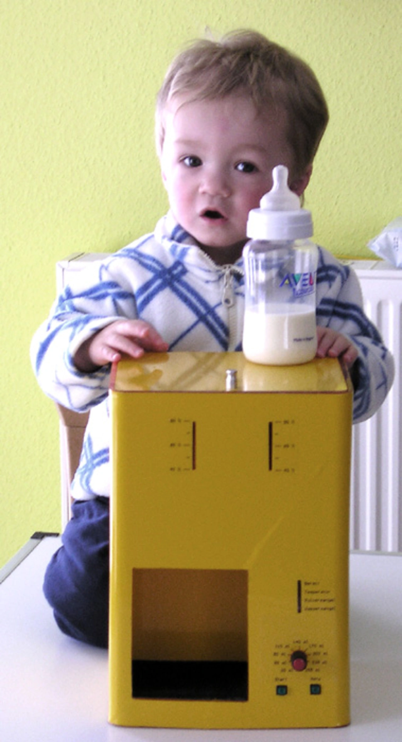 Der „Baby-Flaschen-Mix-Automat“ (Bild 4) besteht aus einem Plexiglasgehäuse, welches nur unwesentlich größer ist als eine Kaffeemaschine. In diesem Gehäuse sind drei Vorratsbehälter untergebracht. Zwei dieser Behälter mit jeweils 350 ml Fas-sungsvermögen sind durch ein Verbindungsrohr miteinander verbunden und sind für den Wasservorrat vorgesehen. Ein Behälter mit 350 ml Fassungsvermögen ist für den Milchpulvervorrat gedacht und ist direkt über dem zu füllenden Milchfläschchen angebracht. Die Vorratsbehälter können durch Öffnen des Gehäusedeckels jederzeit neu befüllt werden. Die Füllstände lassen sich durch Sichtfenster an der Gehäusefrontseite kontrollieren. Während des automatischen Befüllvorganges wird zusätzlich eine Kontrolle der Füllmengen durchgeführt.